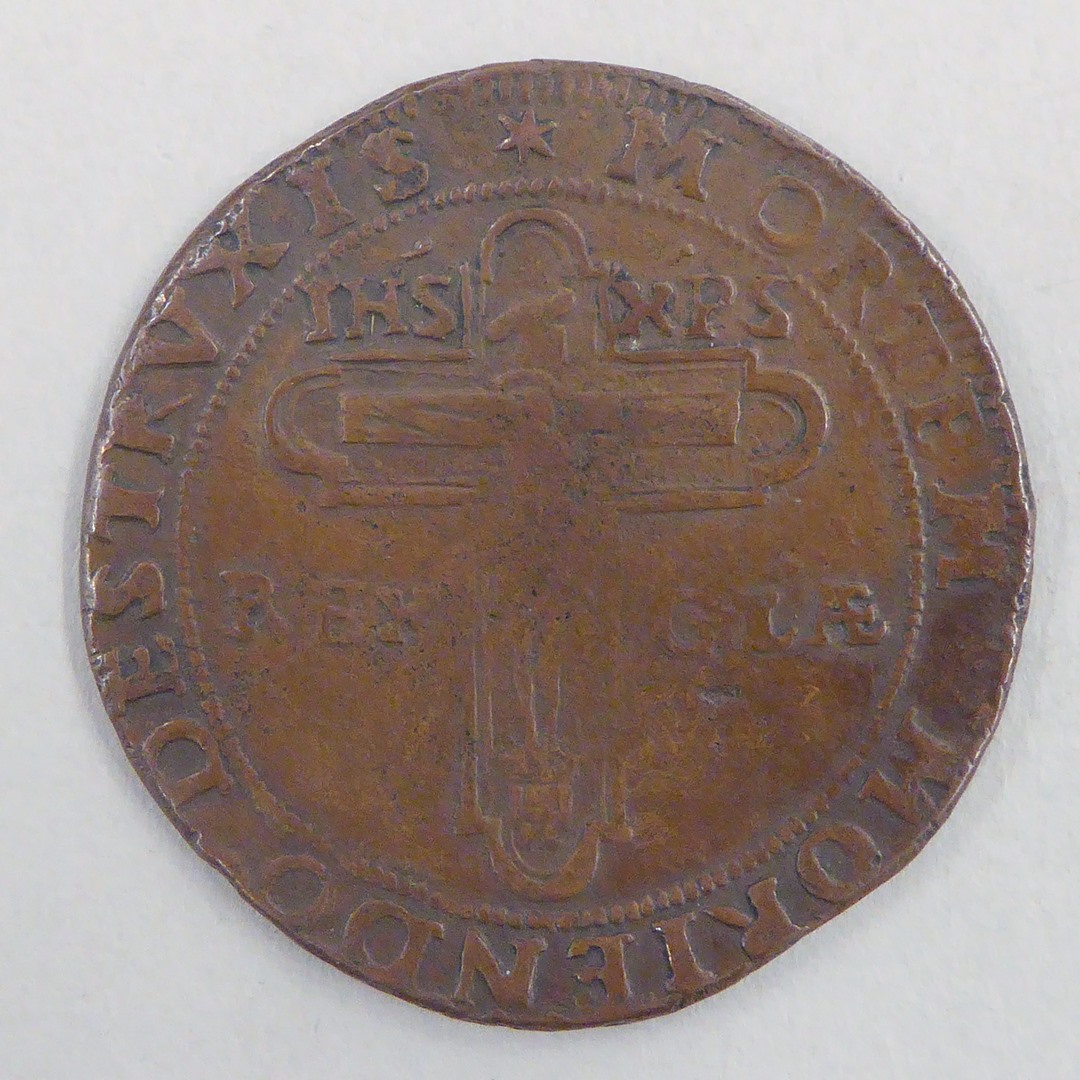 Devotiepenning met Christus aan het kruis, met "Mortem moriendo destruxis", kz. met "Xps faot ..."
