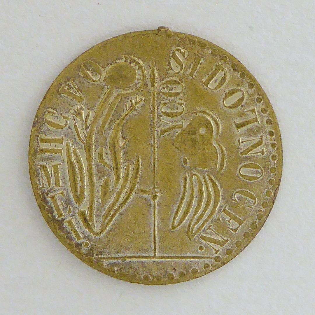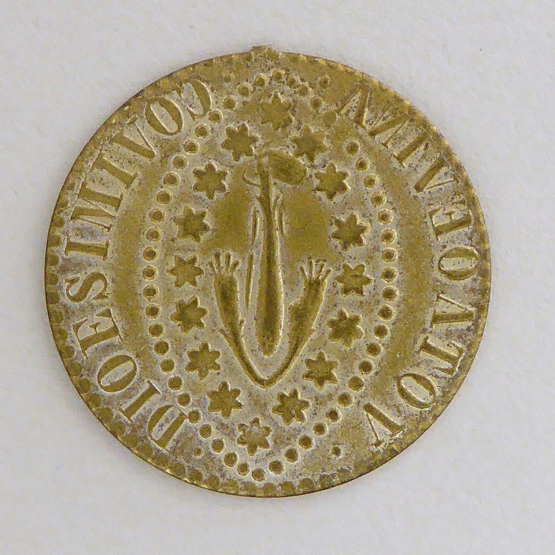 Draagpenning(?) met bloemfiguur(?) tussen sterren, kz. figuur met lans, tekst