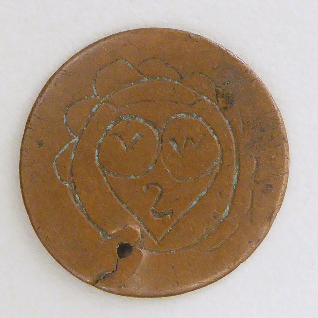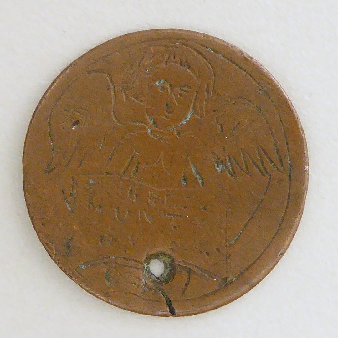 Penning met engel met tekstblad, kz. hart in cirkel met "VWS"