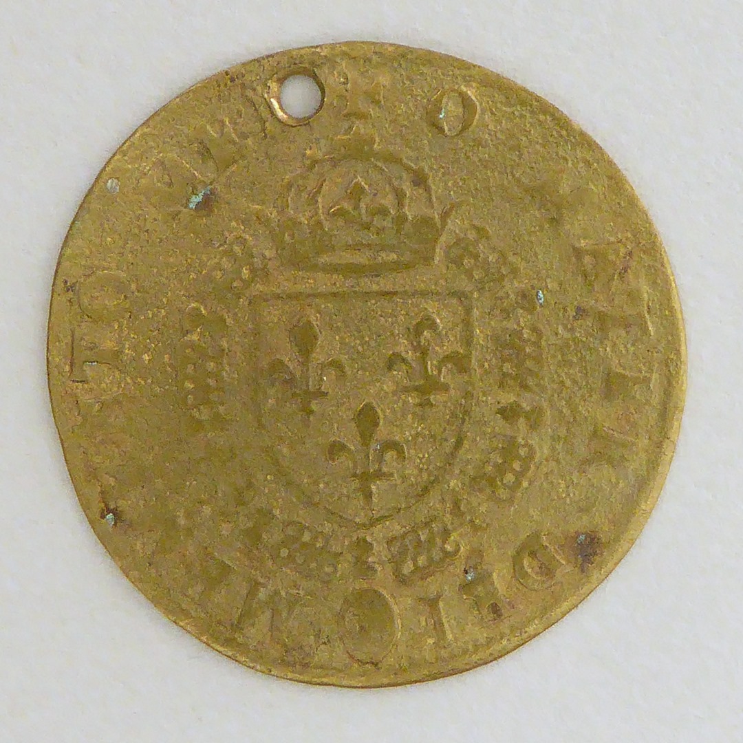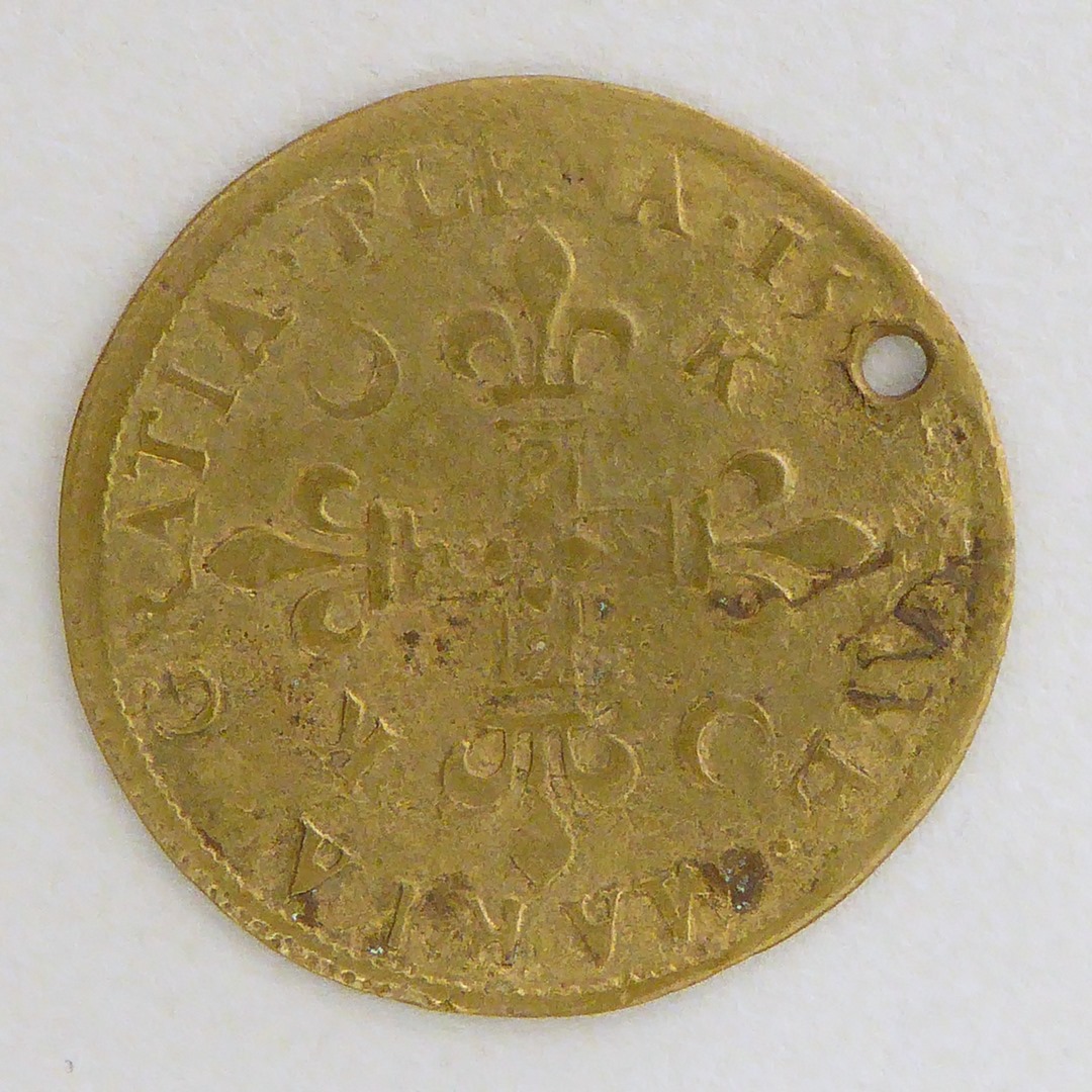 Penning met wapenschild en "Memento mei o mater dei", kz. leliekruis, met "Ave Maria gratia ..."