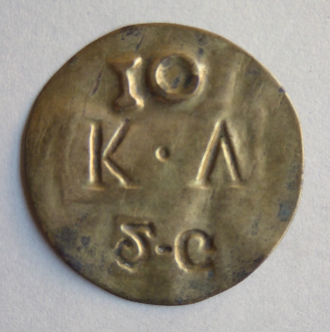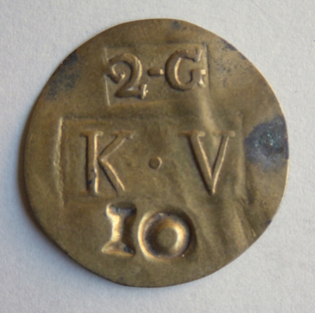 Penning met "K.V. 2.G. 10", kz. blanco