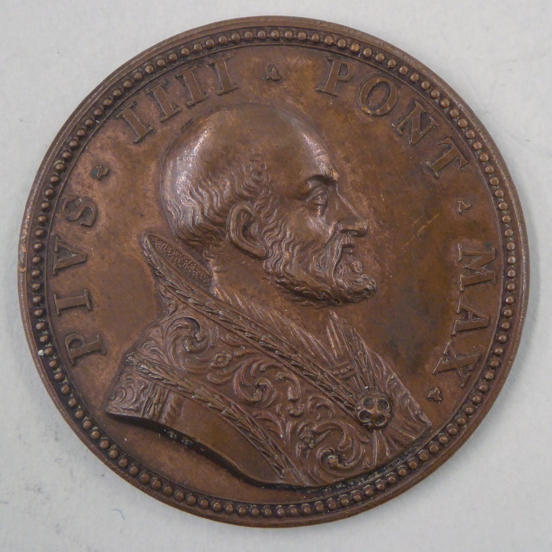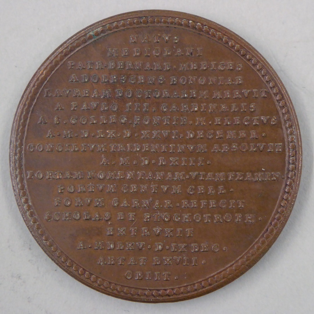 Pauspenning met portret paus Pius IV (1559-1565), kz. opschrift (Latijn) levensloop "Natus ... obiit"