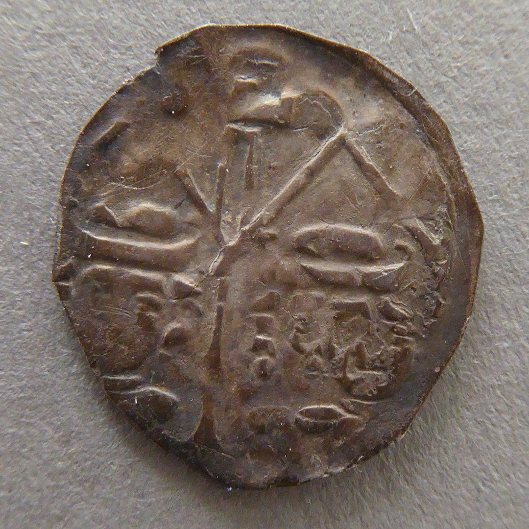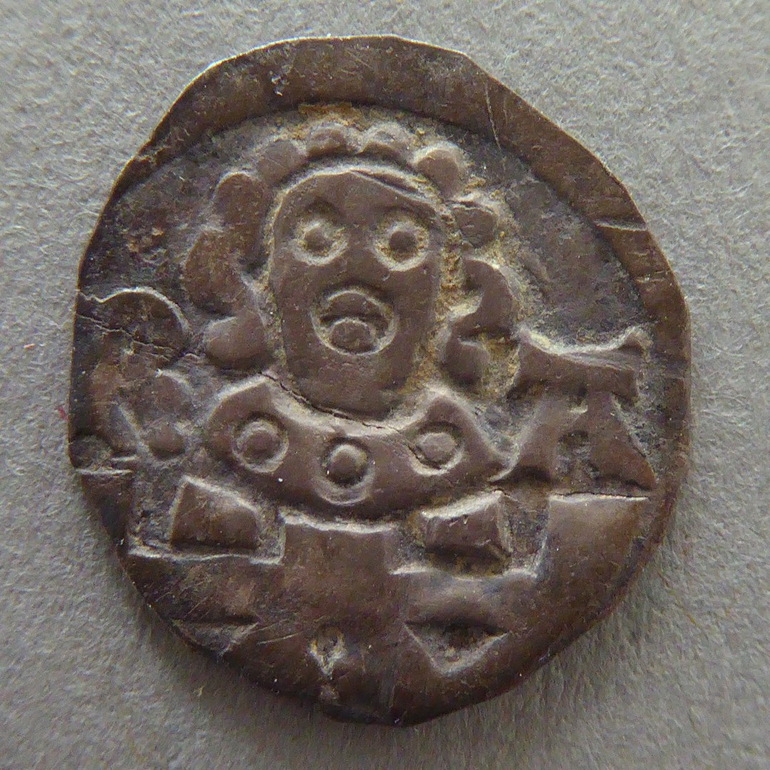 Pfennig van een van de paltzgraven van Arnberg met kop, kz. twee koppen, hertog en bisschop