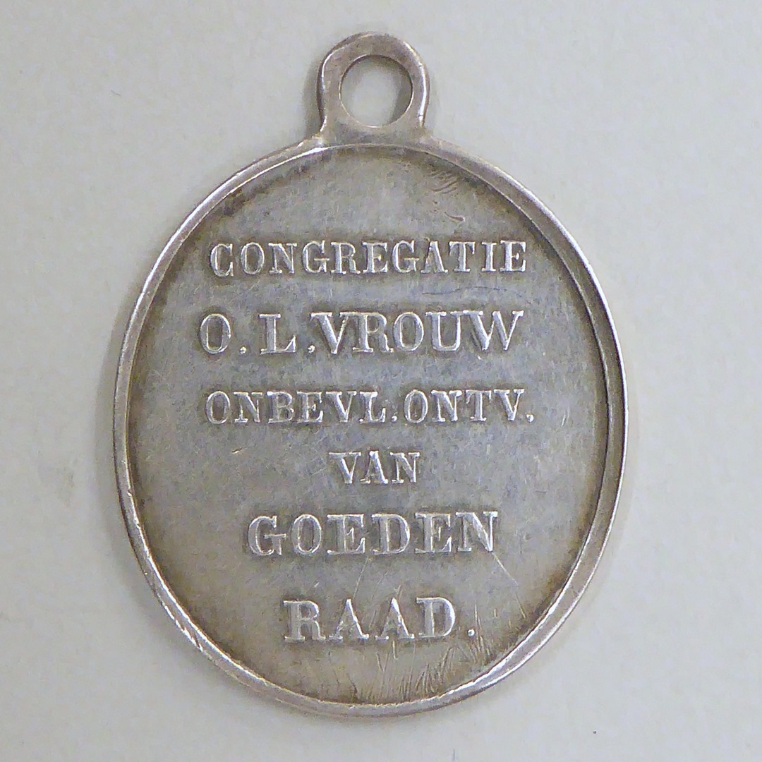 Draagpenning, ovaal, Congregatie O.L.V. Onbevlekt Ontvangen van Goede Raad met Maria, kz. tekst