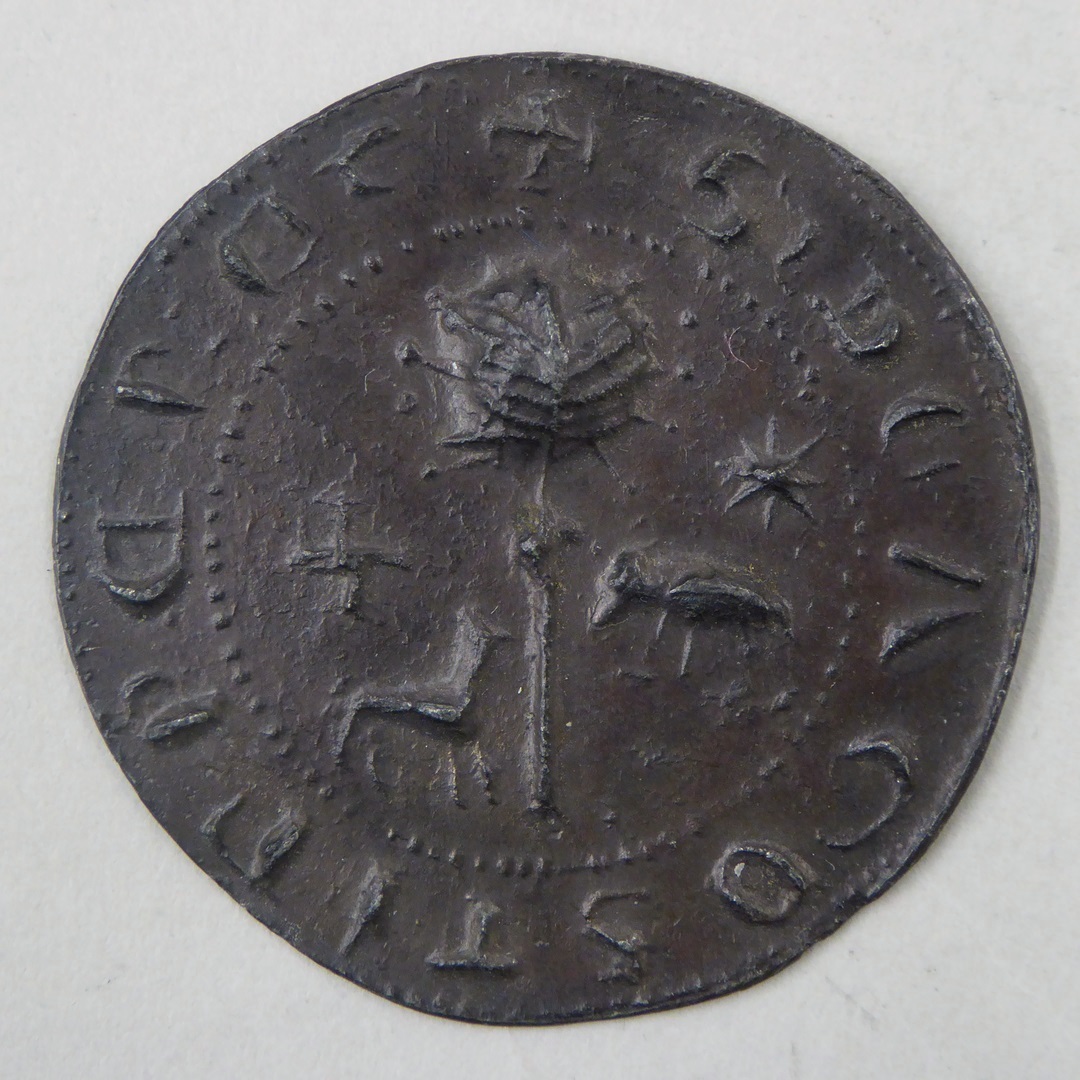 Penning met boom met twee dieren, met randschrift, kz. blanco