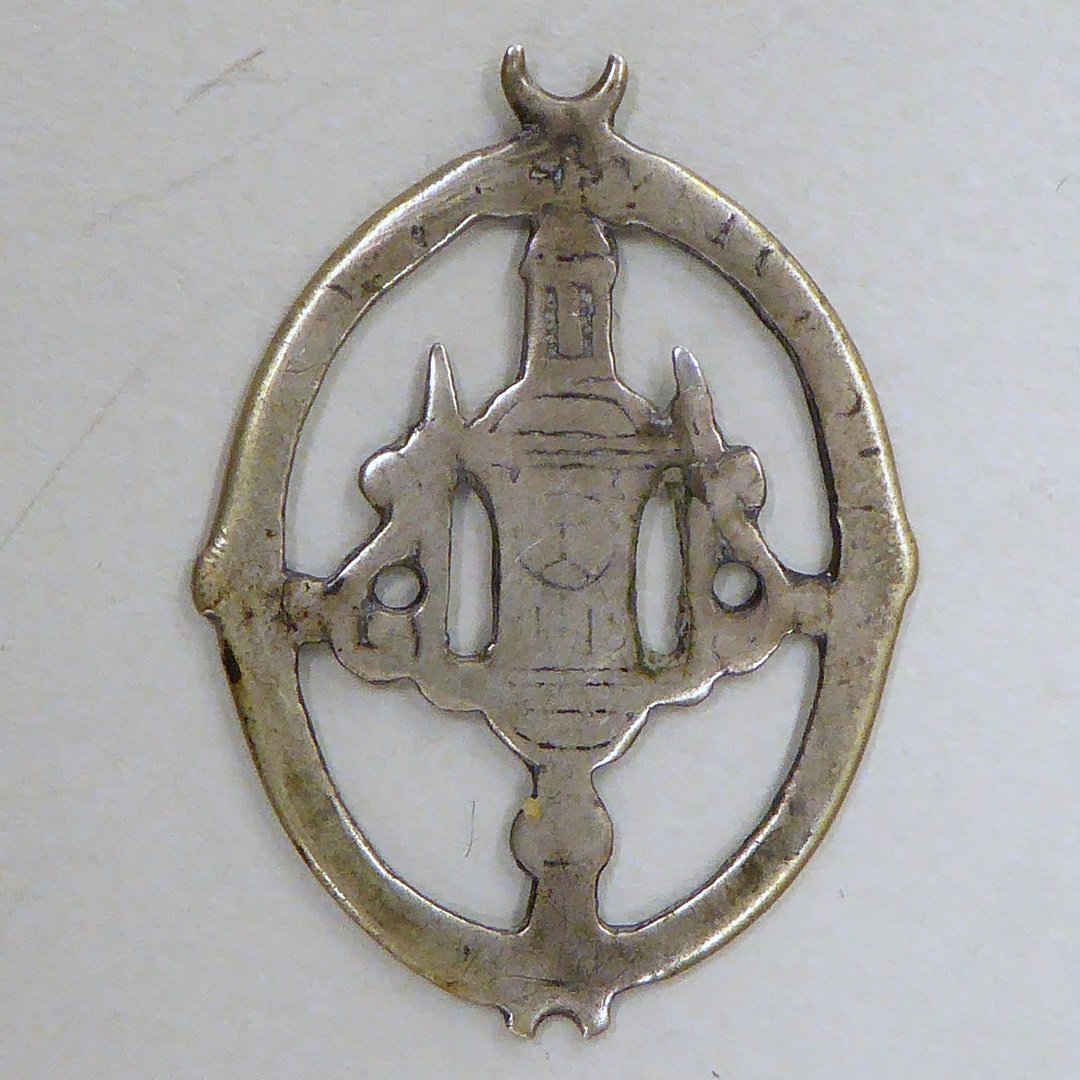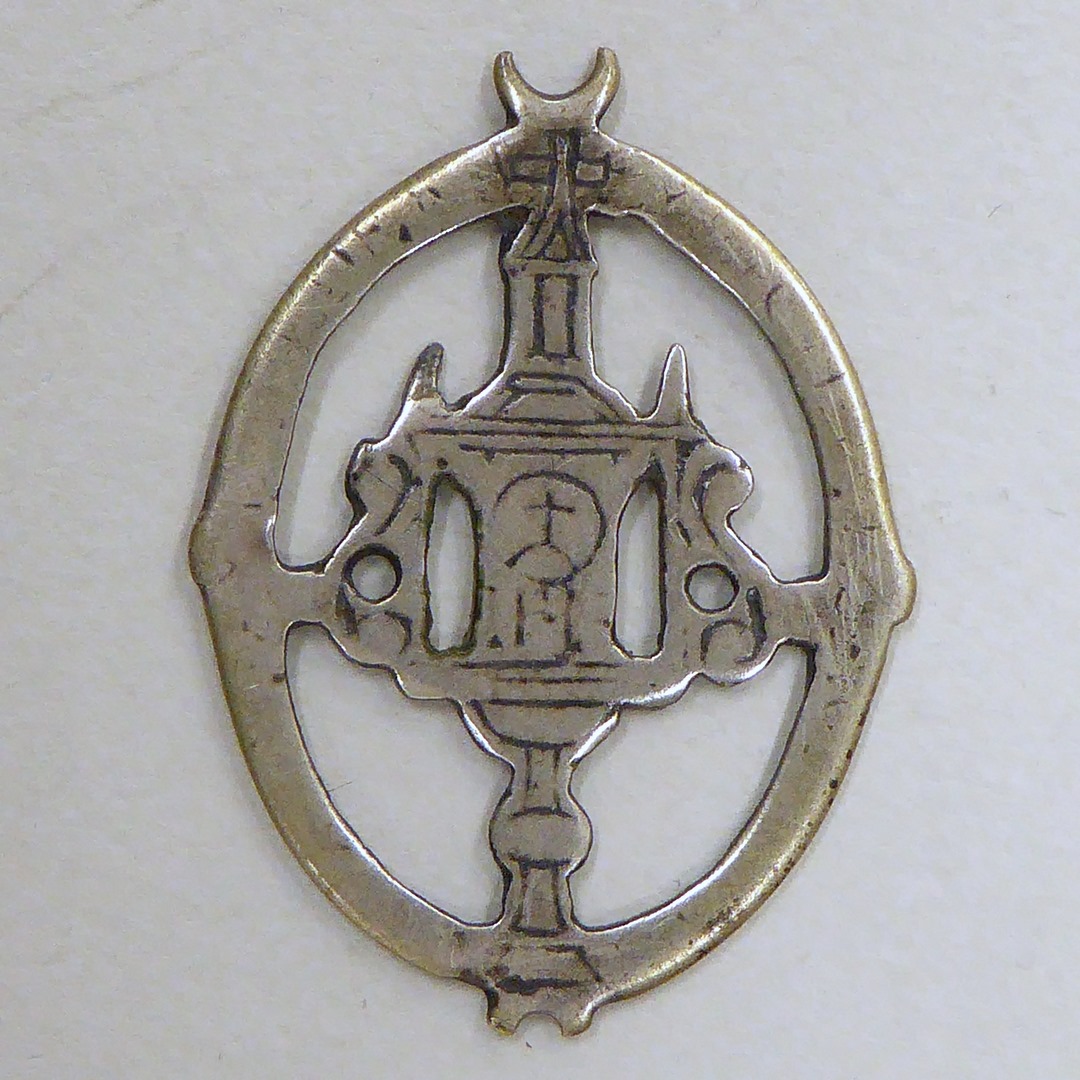 Draagpenning, ovaal ajour, met H. Sacrament van Brussel, kz. monstrans, versleten