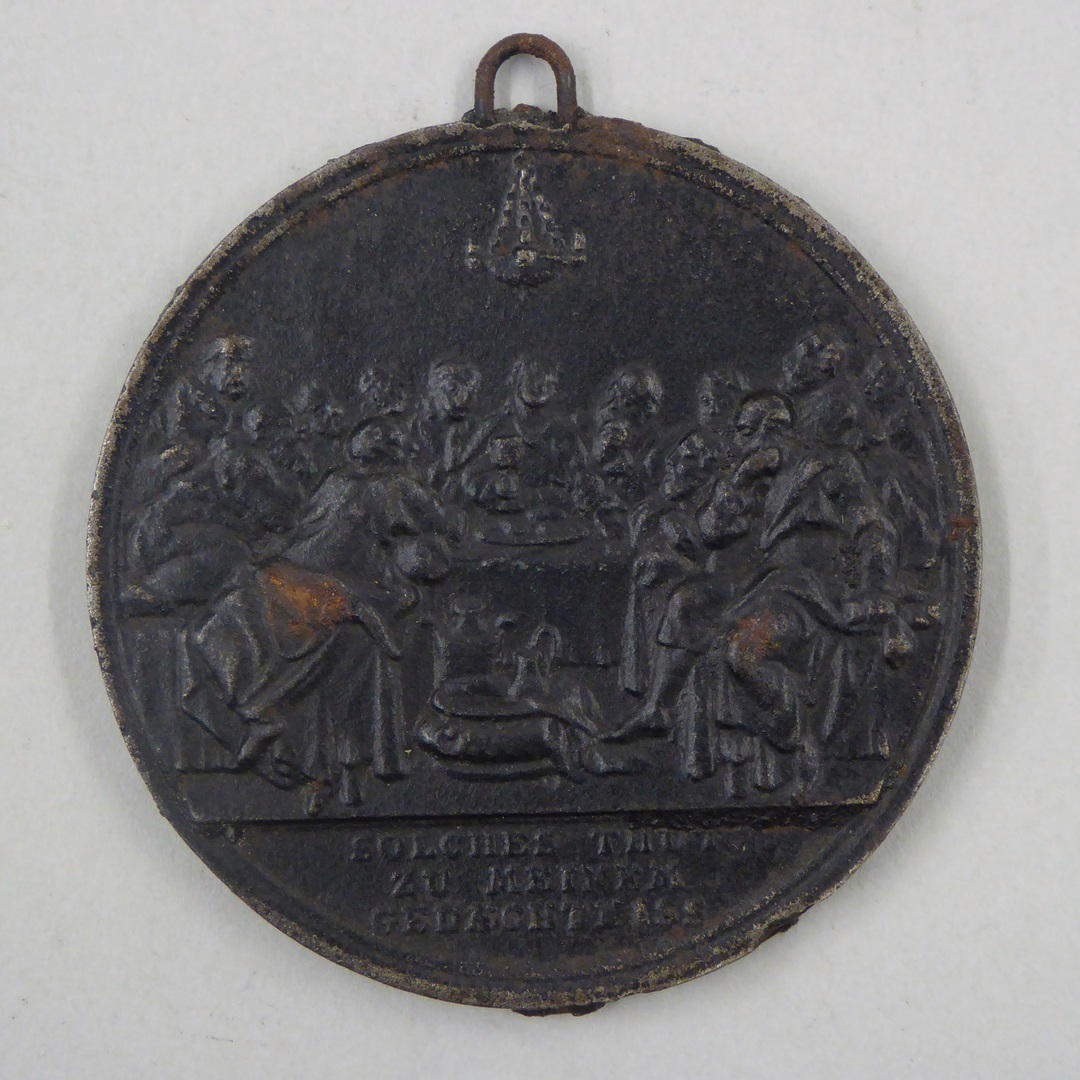 Penning met laatste avondmaal, kz. vrouw met lauwerkrans, met "... Krone des Lebens geben"