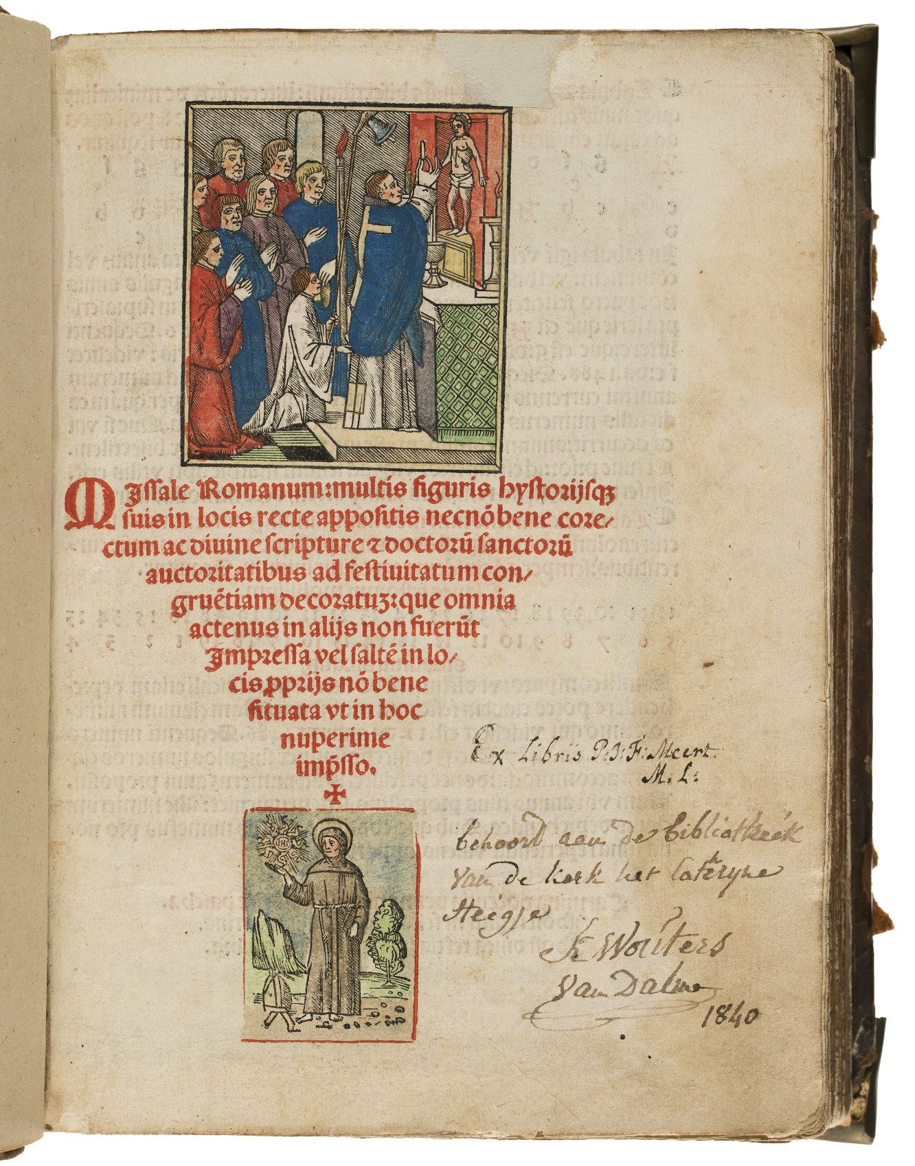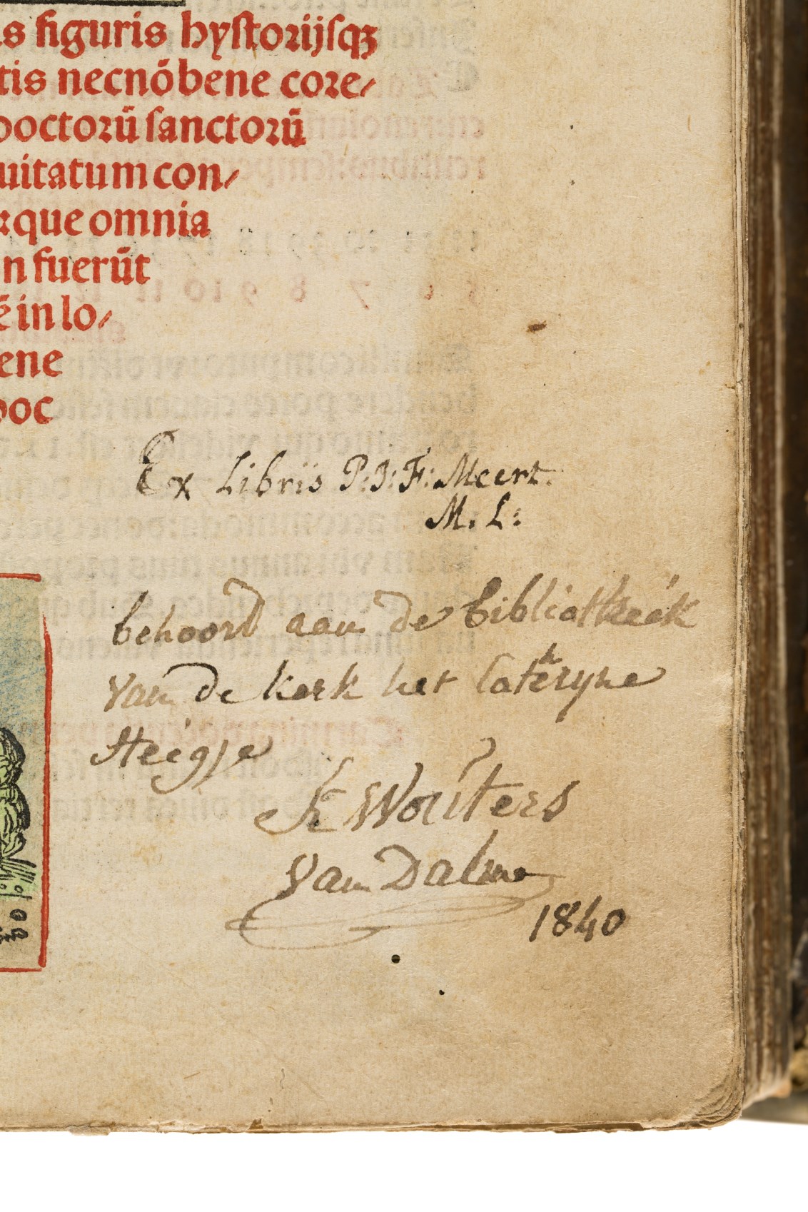 Twee opschriften op de titelpagina die betrekking hebben op de herkomst ervan. Een is gedateerd 1840 en verklaart dat het boek ‘behoort aan de bibliotheek van de kerk het Catharijnesteegje’. De andere is een ex-libris van Philippe Jean François Meert (1724-1801) betreft, een arts en prominent burger van Aalst. Meert stond bekend als een verwoed ...