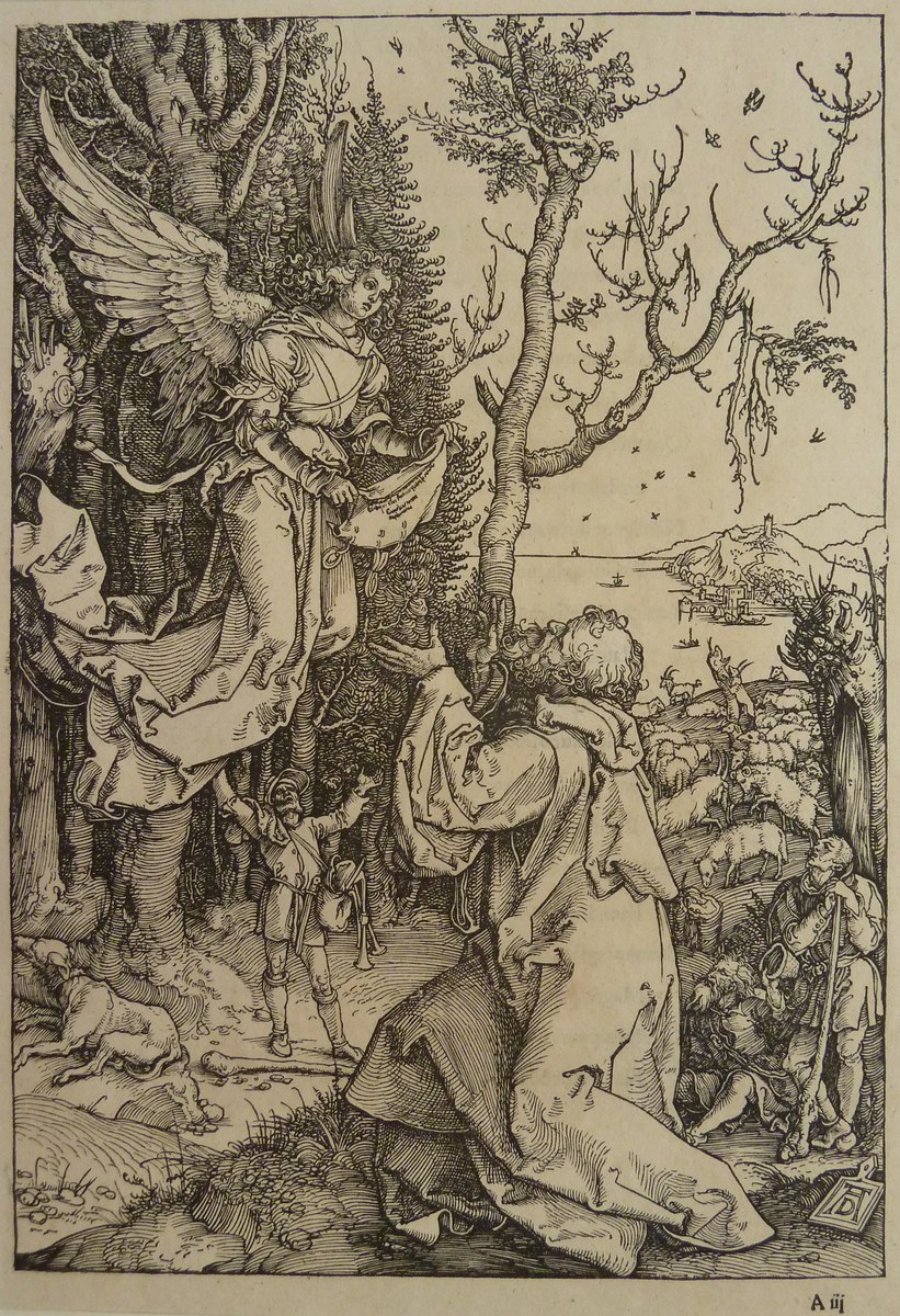 In een bos knielt Joachim voor een engel, die de geboorte van zijn dochter Maria aankondigt. Op de achtergrond enkele herders en hun kudden. Nog verder op de achtergrond een baai. Op versozijde gedrukte Latijnse tekst. Deze prent is onderdeel van een serie van 20 prenten, bestaand uit een titelprent en 19 prenten met scènes ...
