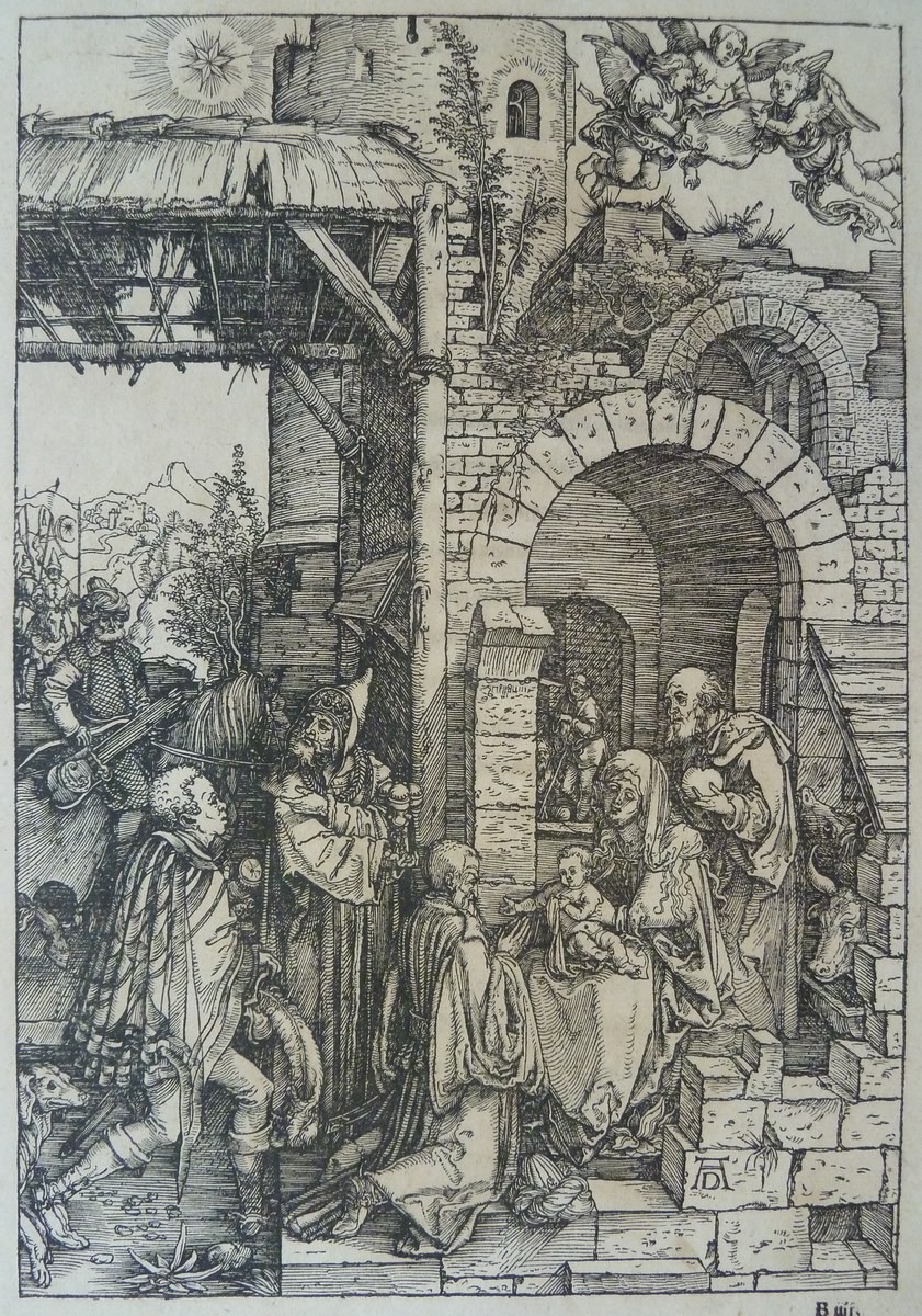 Maria zit met het Christuskind op schoot bij de ingang van een vervallen gebouw. Achter haar staat Jozef. De drie koningen of wijzen uit het Oosten bieden Christus hun geschenken aan. Op versozijde gedrukte Latijnse tekst. Deze prent is onderdeel van een serie van 20 prenten, bestaand uit een titelprent en 19 prenten met scènes ...