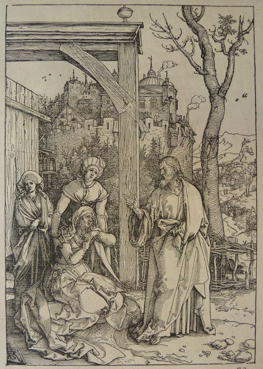 Maria knielt met van verdriet vertrokken gezicht voor Christus, die afscheid van haar neemt. Twee vrouwen (Martha en Maria Magdalena) staan achter Maria. Op de achtergrond een burcht of stad. Op versozijde gedrukte Latijnse tekst. Deze prent is onderdeel van een serie van 20 prenten, bestaand uit een titelprent en 19 prenten met scènes uit ...