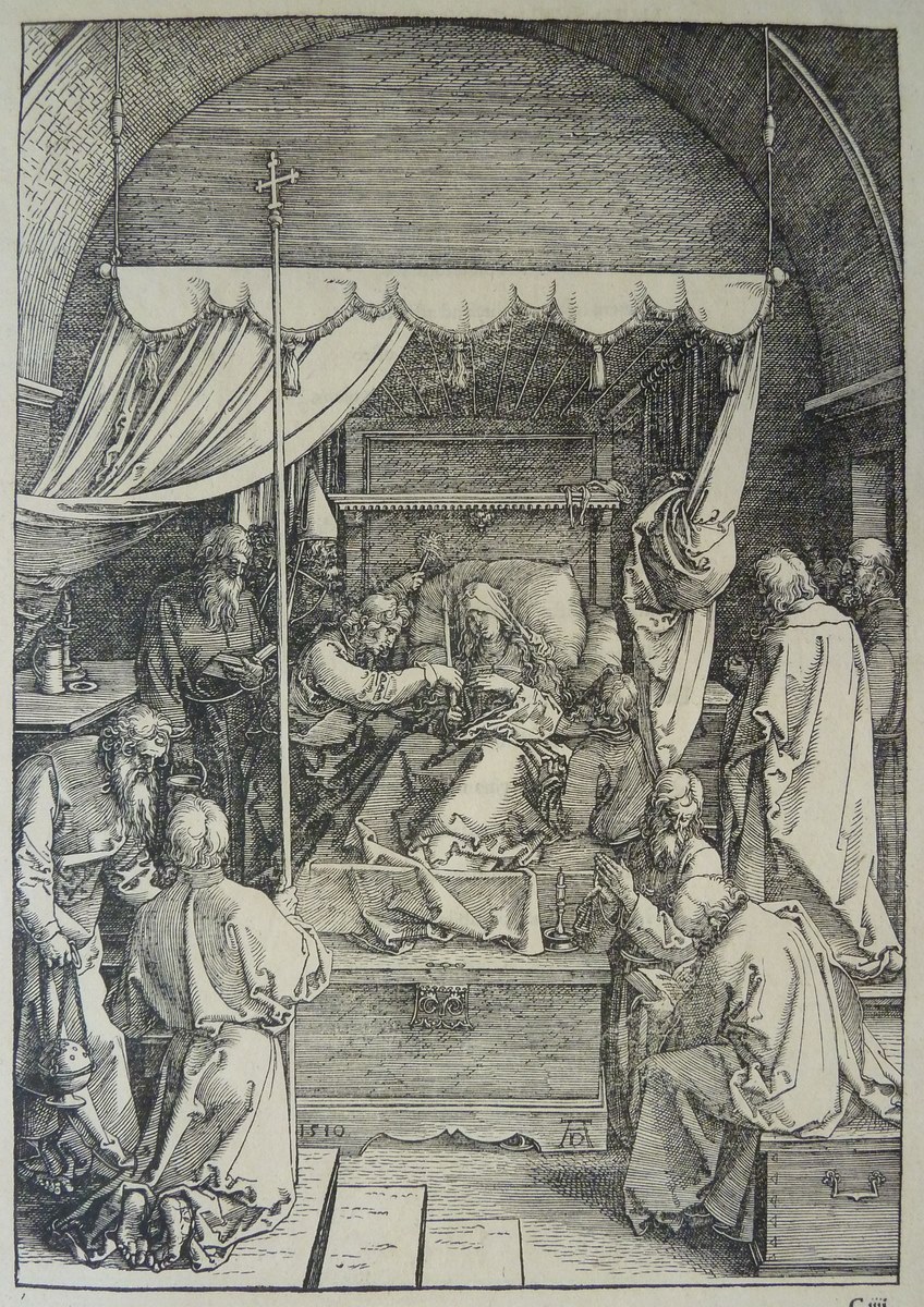 Maria ligt in een hemelbed, omringd door de apostelen. Een van hen drukt haar een kaars in de handen. Op versozijde gedrukte Latijnse tekst. Deze prent is onderdeel van een serie van 20 prenten, bestaand uit een titelprent en 19 prenten met scènes uit het leven van Maria.