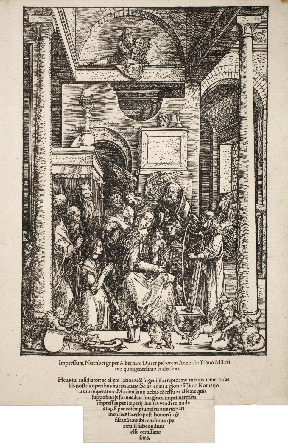 Maria zit in een vertrek met het Christuskind op schoot, omringd door engelen en heiligen (Jozef, Catharina, Johannes de Doper, Hiëronymus, Antonius, Paulus en - hoewel niet helemaal zeker - Augustinus). Onder de voorstelling Latijnse tekst in boekdruk. Deze prent is onderdeel van een serie van 20 prenten, bestaand uit een titelprent en 19 prenten ...