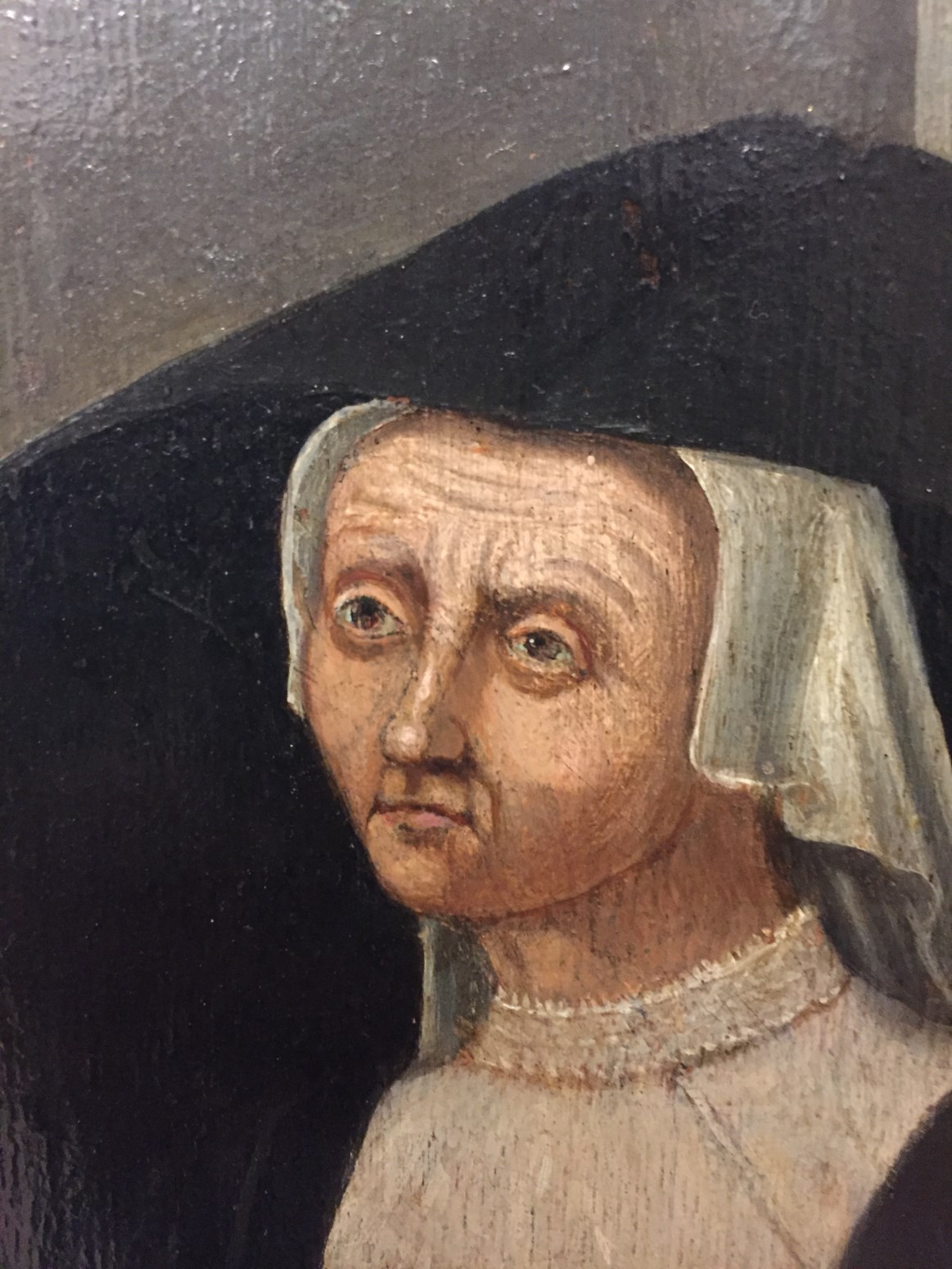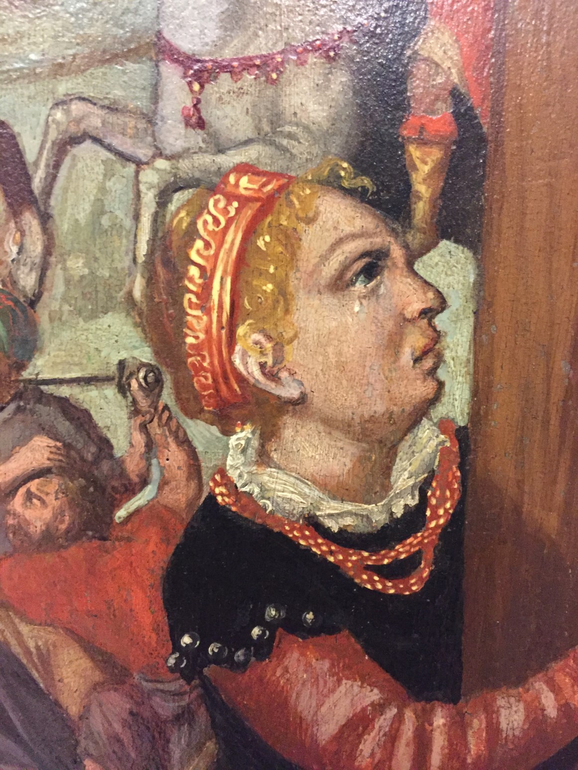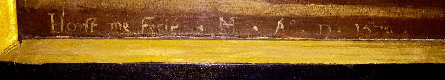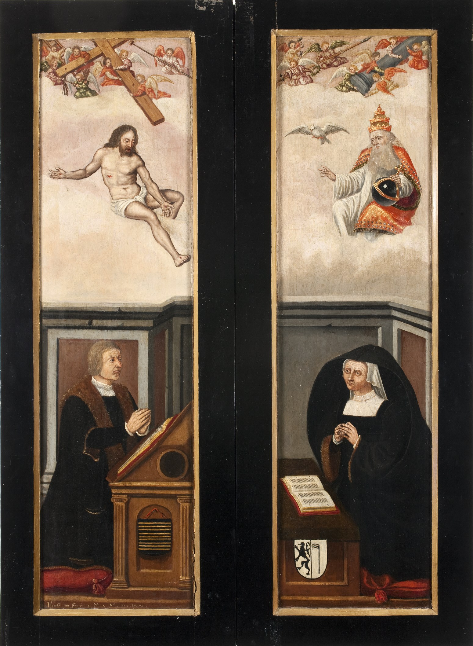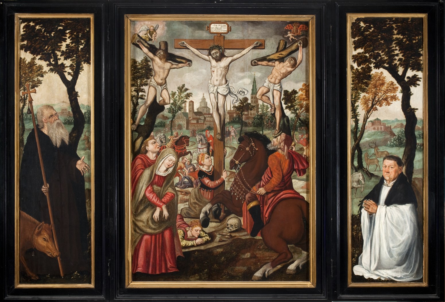 Gesigneerd en gedateerd op de buitenzijde van het linkerluik onderaan: Horst me Fecit . MH (ineen) . A° . D . 1570 . Op het middenpaneel worden de zielen van de twee gekruisigde moordenaars door een engel resp. duivel weggevoerd. Op de luiken links Antonius Abt, rechts een kanunnik. Op de buitenzijde van de luiken ...