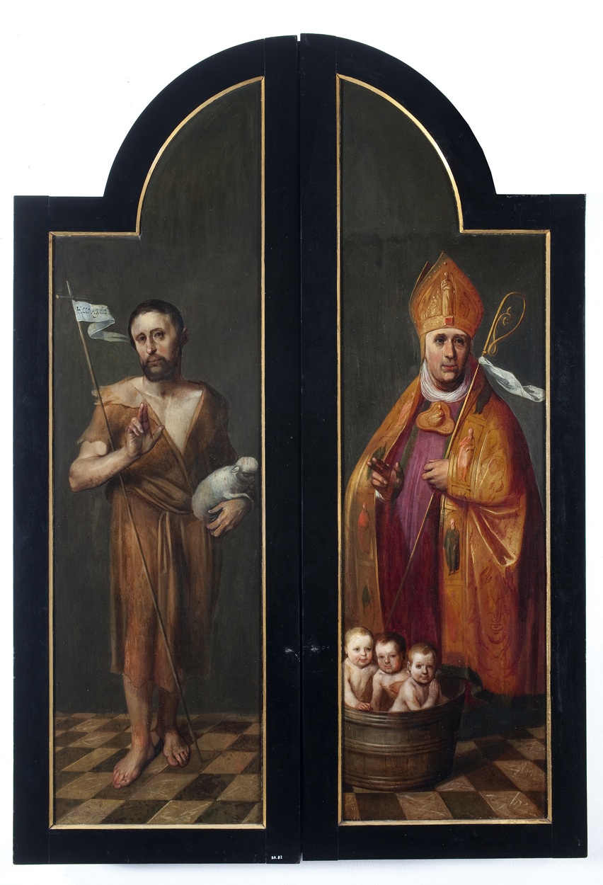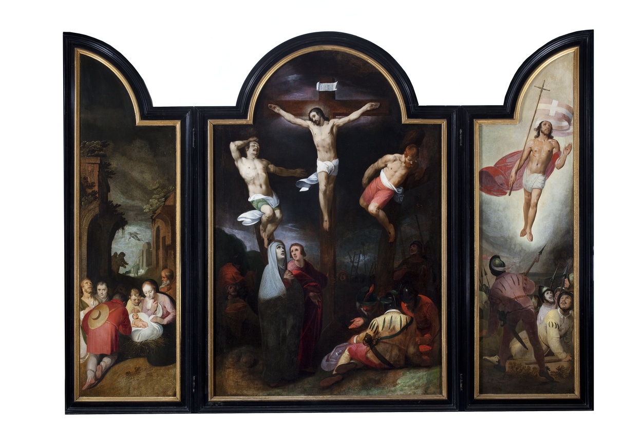 Op de vaan van de lans van de ruiter achter het kruis, rechts op het middenpaneel, de letters SPQR (Senatus Populusque Romanus: de senaat en het volk van Rome). Op het linkerluik de Aanbidding der herders met op het middenplan de Aankondiging aan de herders; op het rechterluik de Opstanding. Op de achterzijde van de ...