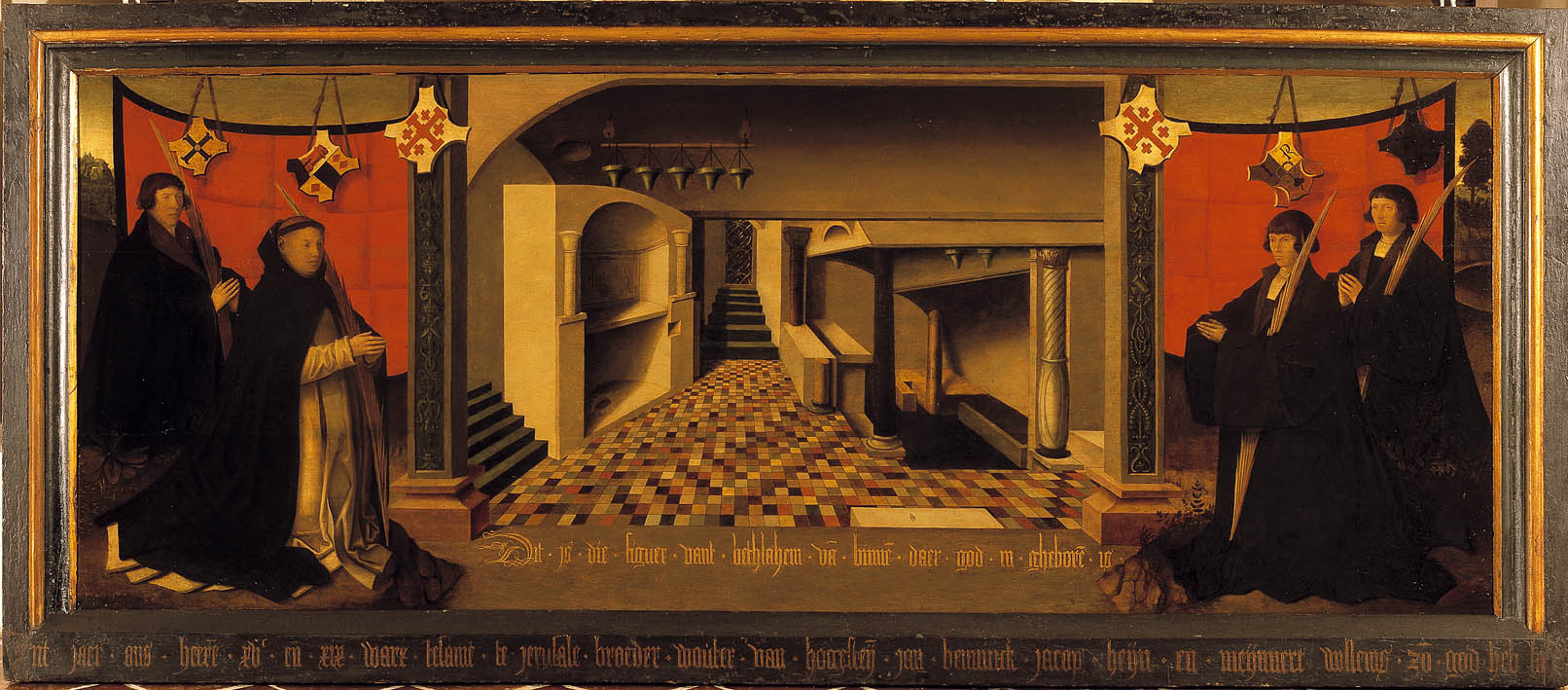 Op de originele lijst de tekst: Int . jaer . ons . heere[n] . XVc . en .XIX . ware[n] . tesame[n] . te . jerusale[m] . broeder . wouter . van hoogsteij[n] . jan benninck . jacop . heijn . en . meijnnert . willems . zo[o] .god . heb . lof. Onder de ...