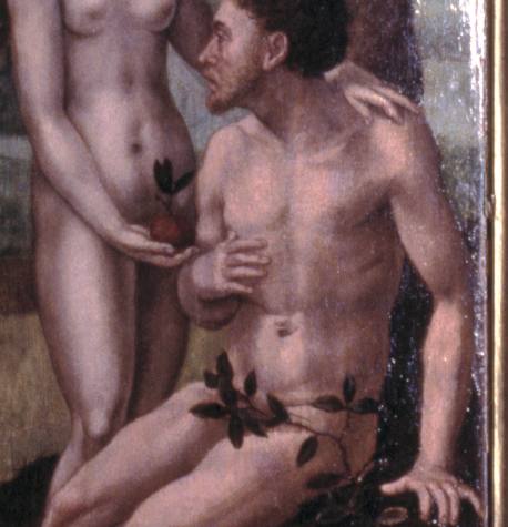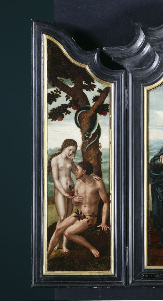 Op het middenpaneel staat het kruis waaraan Christus is genageld in een heuvelachtig landschap met op de achtergrond Jeruzalem (Op het middenpaneel een voorstelling met Christus aan het kruis in een heuvelachtig landschap met op de achtergrond Jeruzalem). Links van het kruis staat Maria, rechts Johannes. Maria Magdalena omvat knielend de kruispaal. Op het linker ...