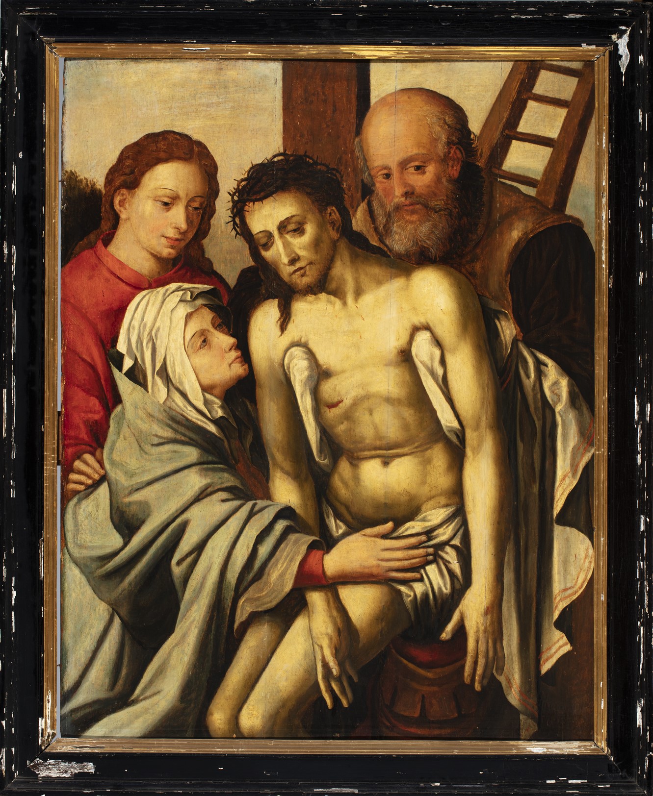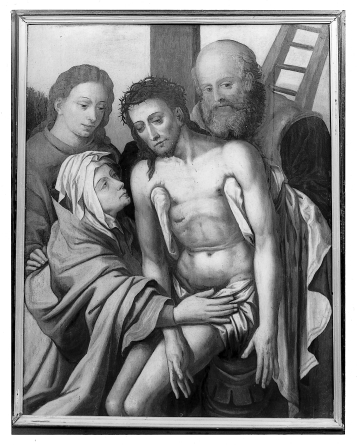 Jozef van Arimatea ondersteunt het lichaam van Christus, dat van het kruis is afgenomen. Links is Maria afgebeeld terwijl zij het lichaam van haar zoon opvangt. Zij wordt gesteund door Johannes, die achter haar staat. De personages zijn voorgesteld als driekwart- en halffiguren. Achter Jozef is de tegen het kruis geplaatste ladder zichtbaar. Op de ...