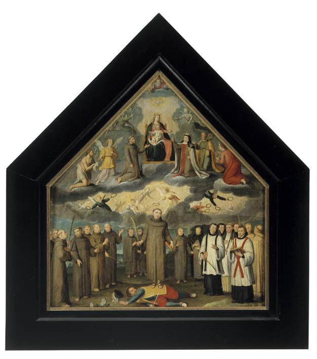 In het centrum van de bovenste rij figuren tronen Maria met kind met daarboven de duif, symbool van de H. Geest, en God de Vader. De Madonna wordt links geflankeerd door Franciscus, de engel Gabriël met in zijn rechterhand een banderol waarop: ave gratia plena (wees gegroet begenadigde), en Johannes de Doper; rechts door Johanna ...