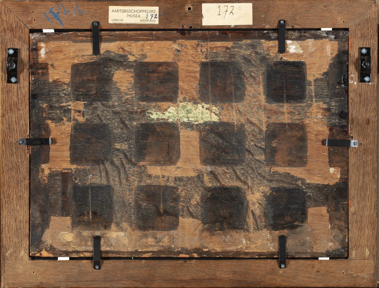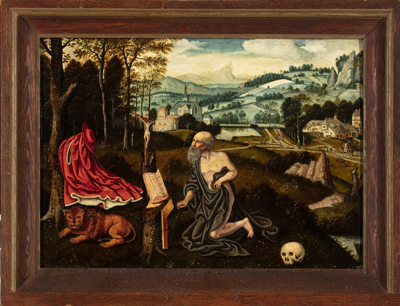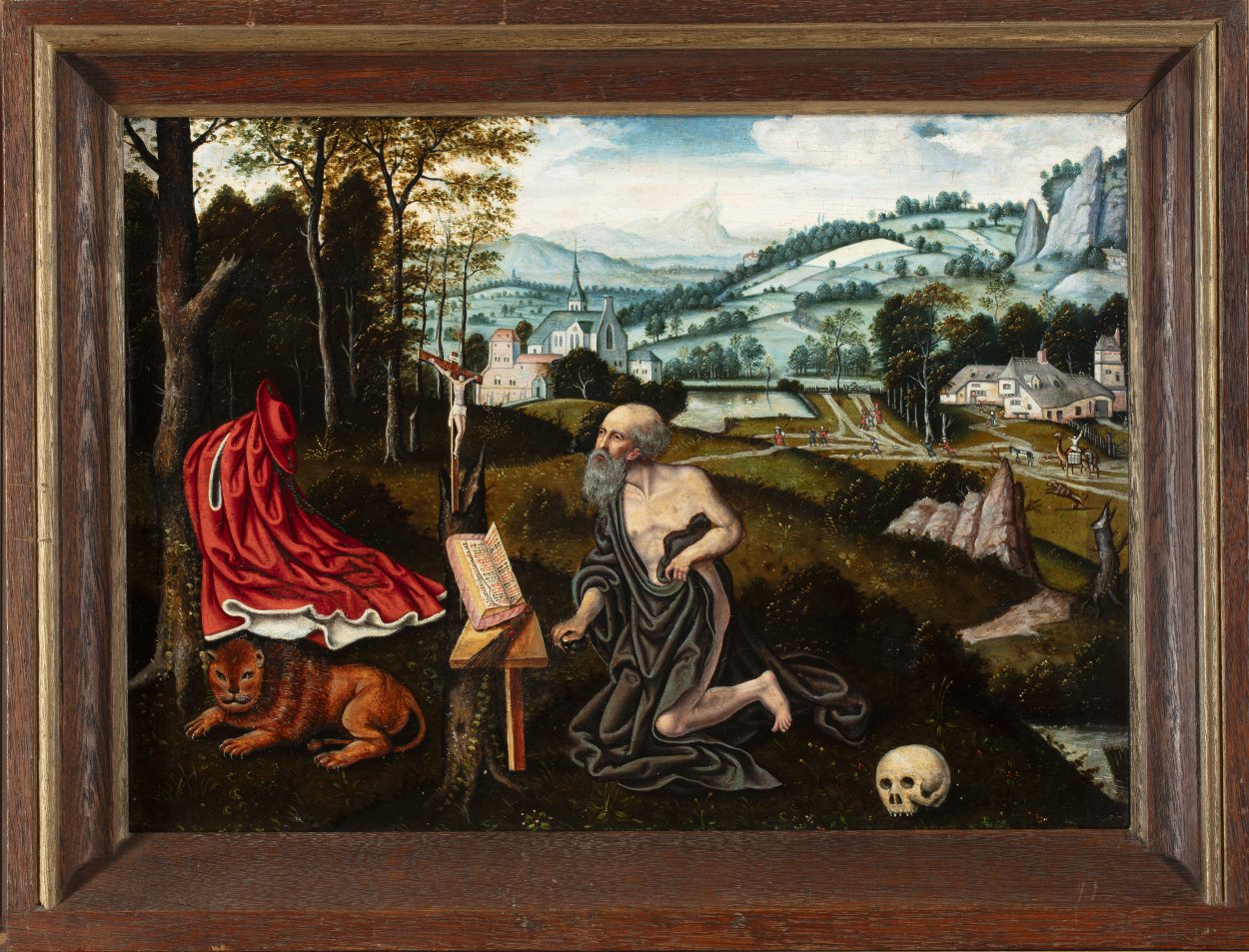 In het landschap rechts een episode uit de Hieronymuslegende met de leeuw die de gestolen ezel en de kooplui met hun kamelen terugbrengt naar het klooster.