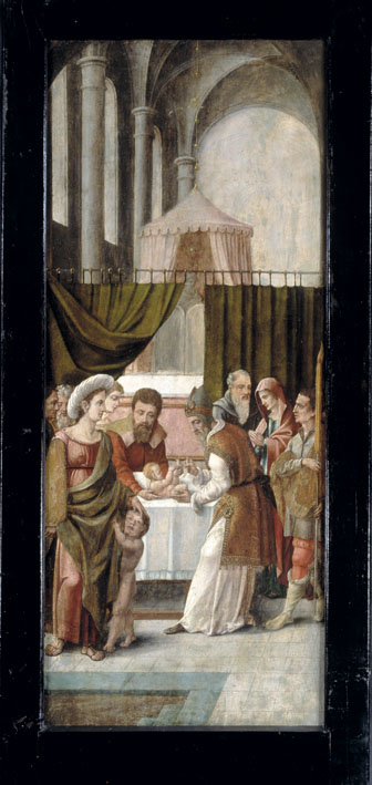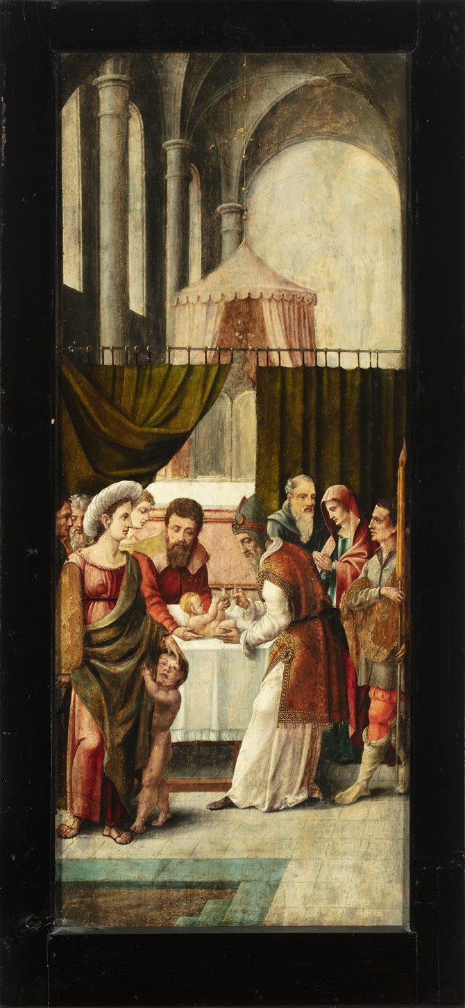 Achter het ten dele opengeschoven gordijn op het linkerluik bevindt zich een altaar met daarop de twee wetstafelen vastgehouden door Mozes staande onder een baldakijn; boven Mozes’ hoofd is een grote bol opgehangen.