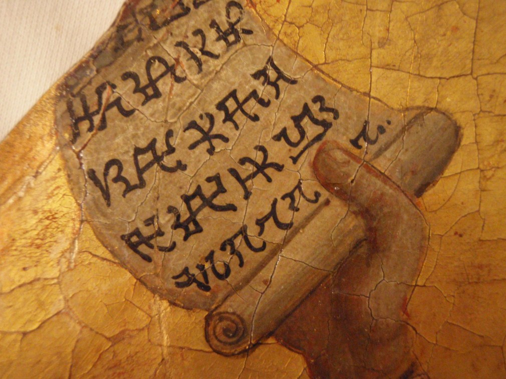 Op de perkamentrol een tekst in cyrillisch schrift