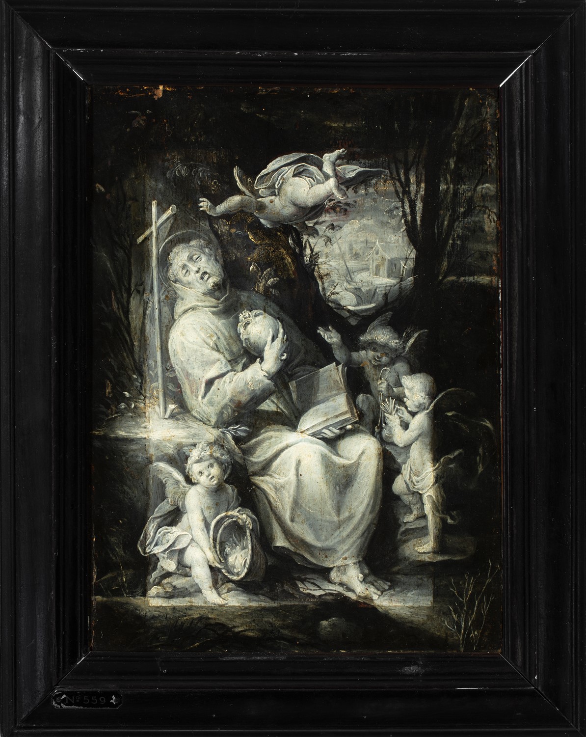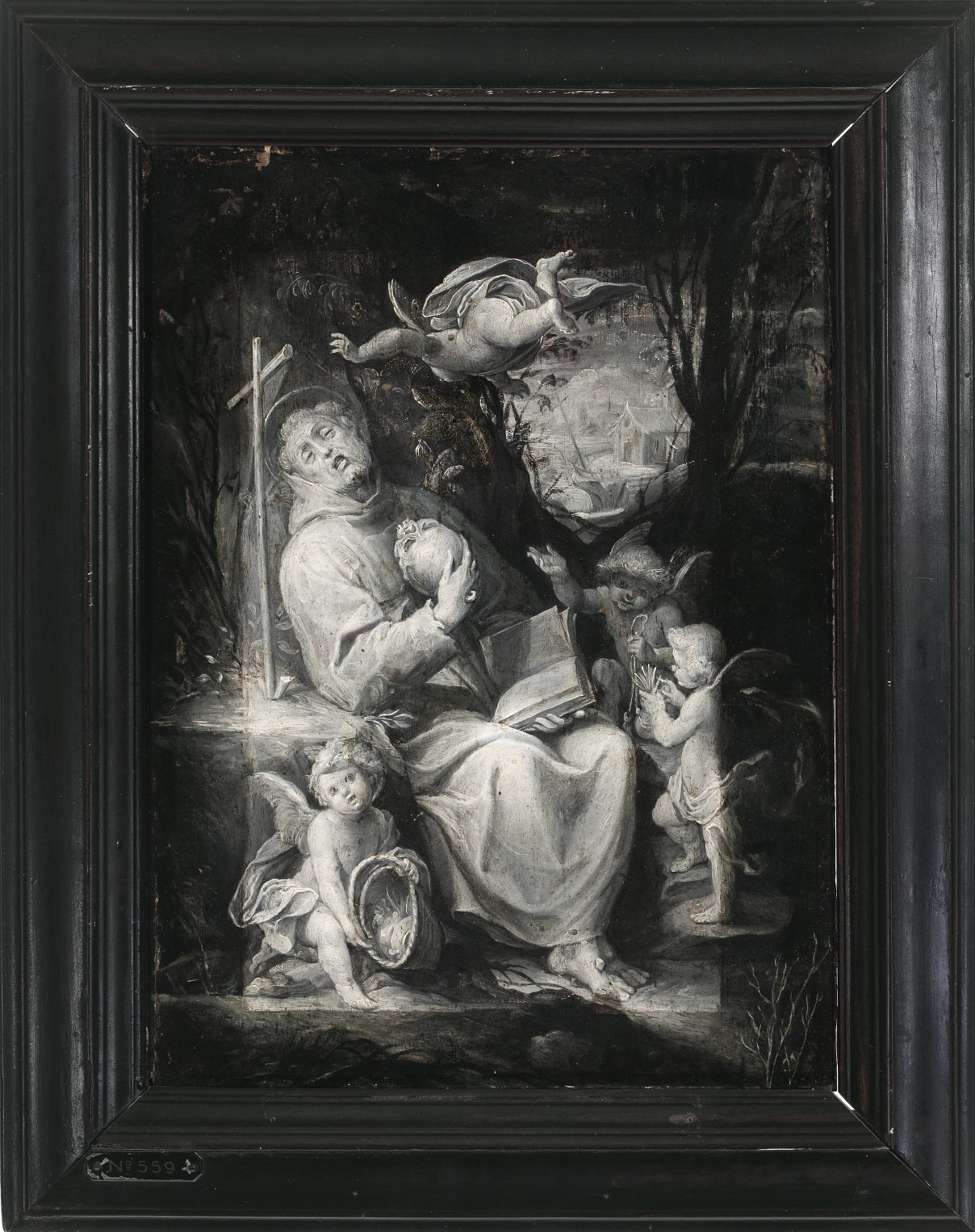 Franciscus, zijn voeten en rechterhand getekend met de stigmata, zit in extase bij een rotsblok waarop een klein kruis staat. Hij houdt een schedel tegen de borst en een opengeslagen boek op schoot, en wordt omringd door vier engeltjes, één zweeft boven zijn hoofd, de andere hebben resp. een mandje, een koord en bloemen bij ...