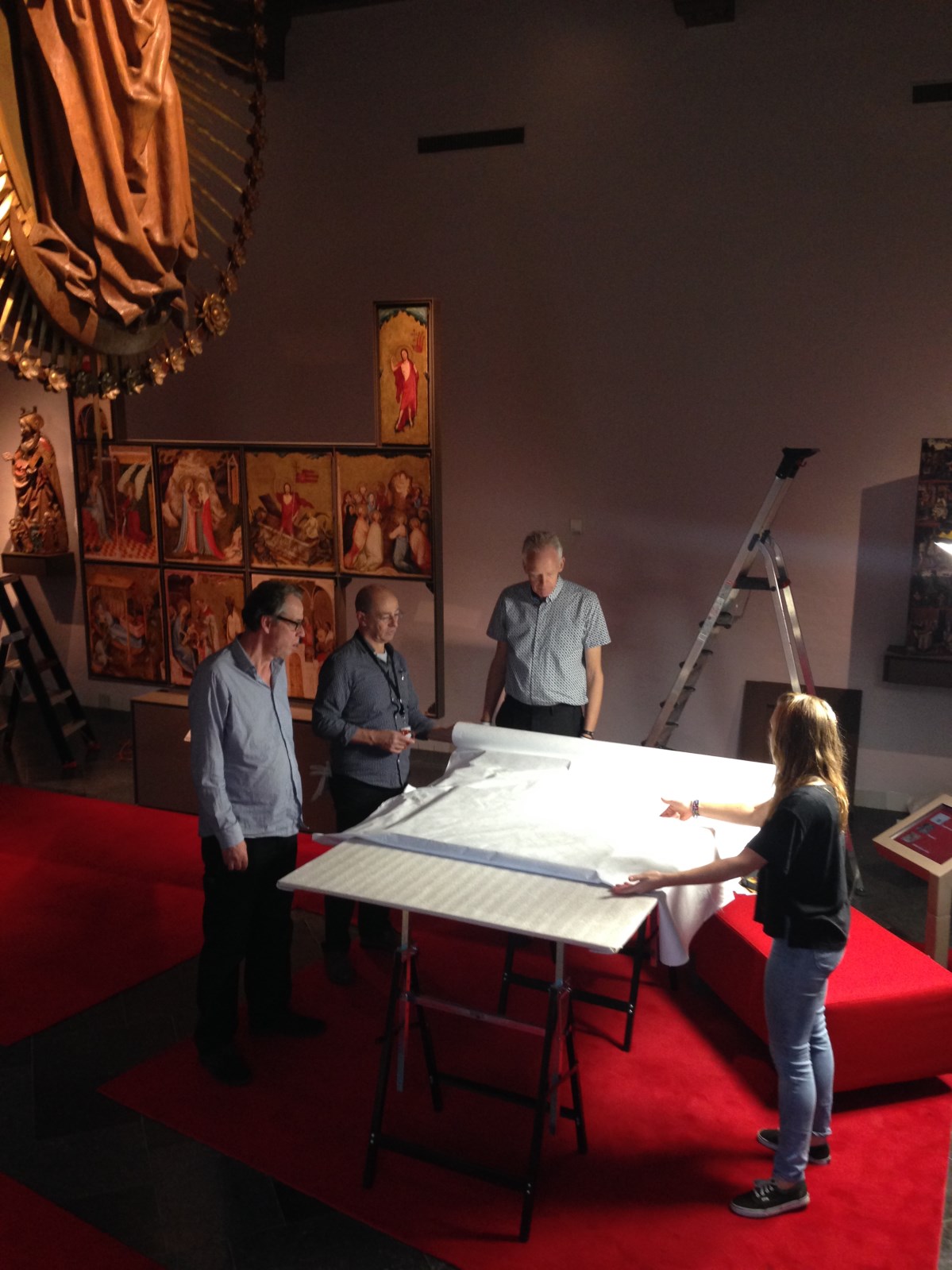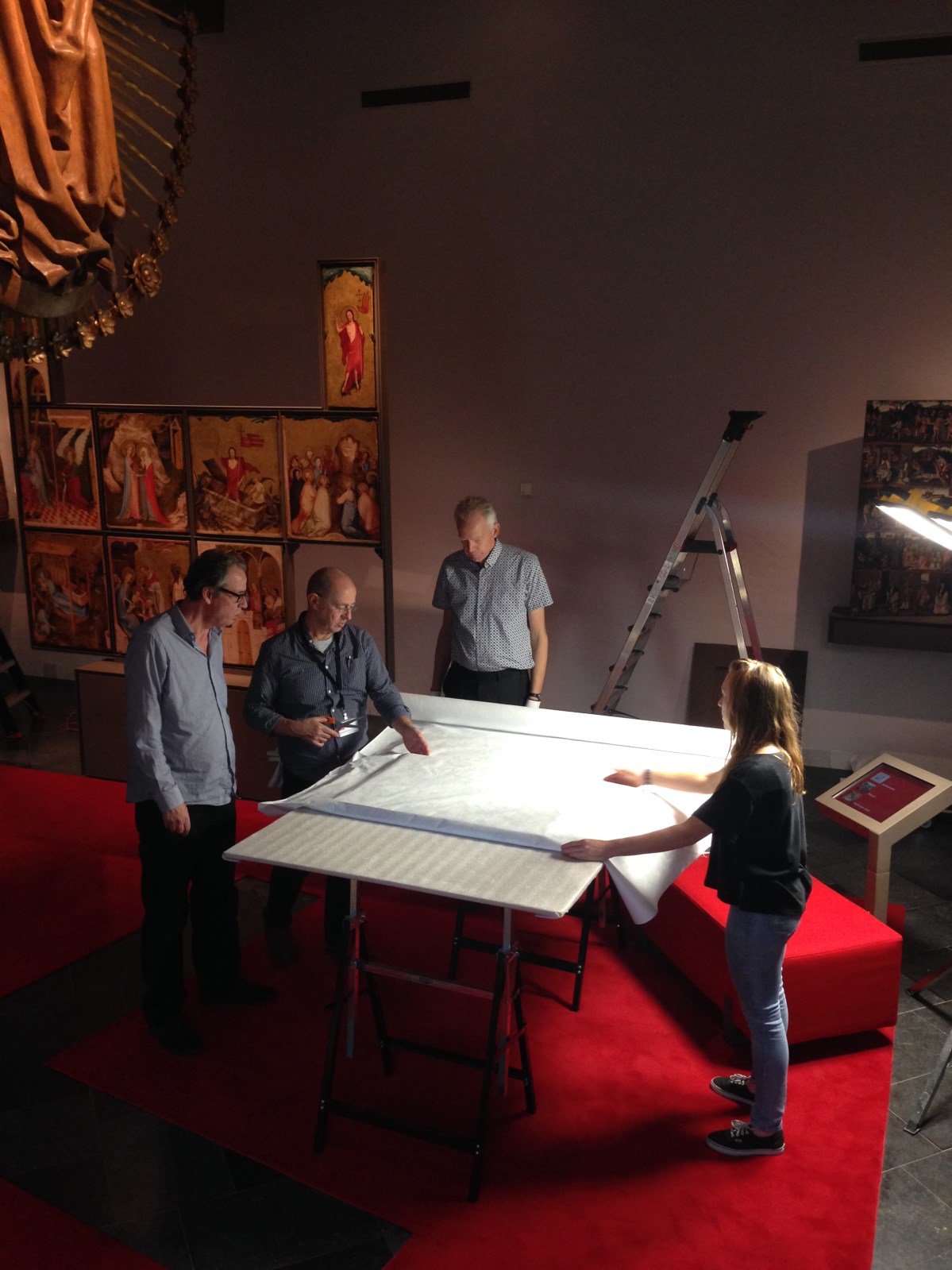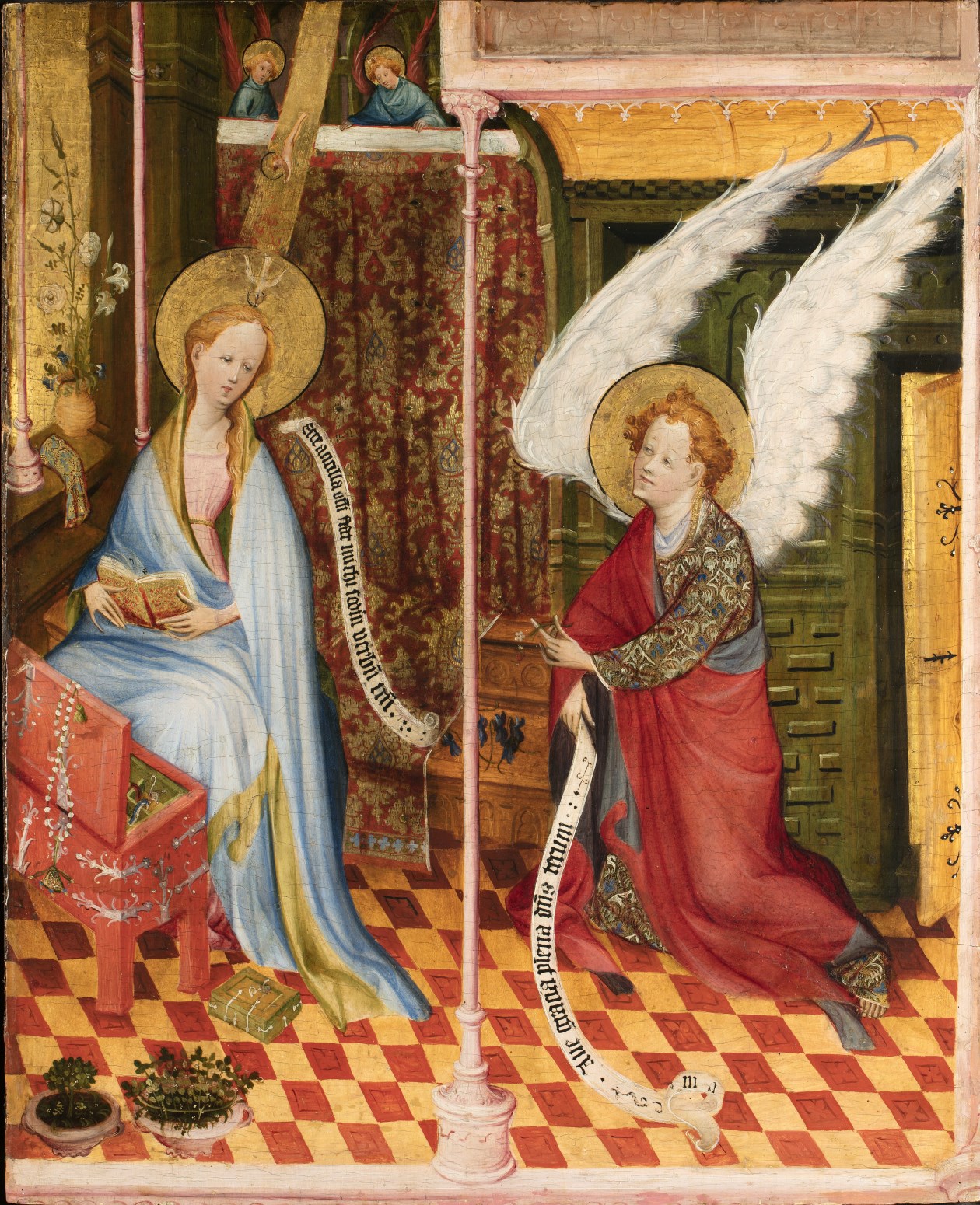 Op de spreukband van de engel: Ave gratia plena d[omi]n[u]s tecum (Gegroet begenadigde, de Heer is met u, Luc. 1:28). Op de spreukband bij Maria: Ecce ancilla d[omi]ni fiat michi s[e]c[un]d[u]m verbu[m] t[uu]m (Zie de dienstmaagd van de Heer, mij geschiede naar uw woord, Luc. 1:38).