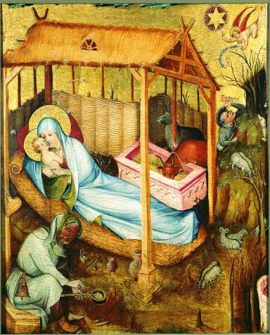 Rechts van de stal waarin de geboorte heeft plaatsgevonden is de aankondiging aan de herders weergegeven. Op de spreukband van de engel die de herder wijst op een grote gouden ster de woorden: Evanglizo vob[is] gaudi[um] magnu[m] (Ik verkondig u grote blijdschap, Luc. 2:10). Boven de herder het opschrift: Transeamu[s] us[que] Betleem (Laten wij naar ...