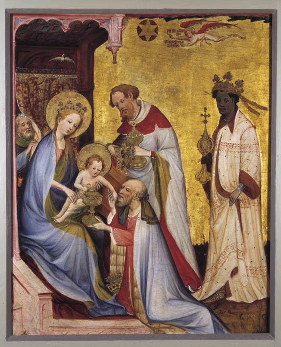 Bij de zwevende engel boven in het beeld de opschriften: Ite in iudeam ubi / nascit rex iudeor[um] (Gaat naar Judea waar de koning van de joden is geboren). De mantel van de morenkoning is versierd met banden met exotische lettertekens.