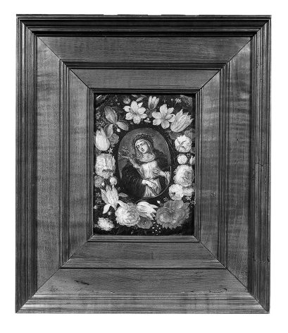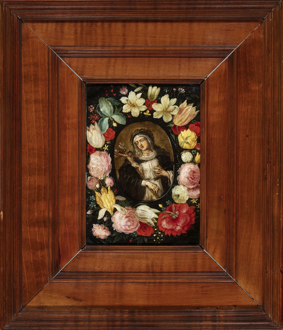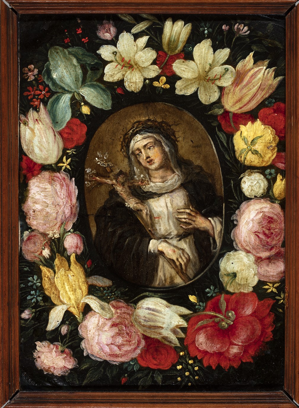 De heilige is gekleed in een dominicaans habijt en heeft een doornenkroon op haar hoofd; haar handen en zijde vertonen de stigmata.