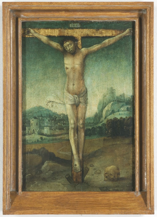 Op de Calvarieberg hangt de dode Christus aan het kruis. Rechts van het kruis ligt de schedel van Adam. Op de achtergrond links Jeruzalem en rechts een kasteel op een berg.