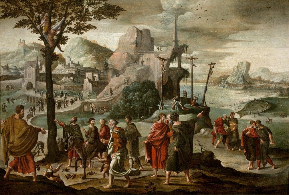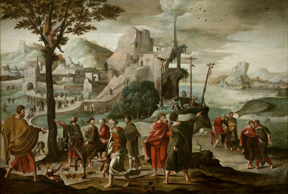 De intocht van Christus in Jeruzalem vindt plaats in een bergachtig landschap met links de stad Jeruzalem en rechts een rivier. Op de voorgrond rijdt Christus op de ezel naar Jeruzalem, begeleid door de apostelen. Links van de stoet een hoge boom met twee figuren die takken afrukken om de weg te bedekken. Op het ...