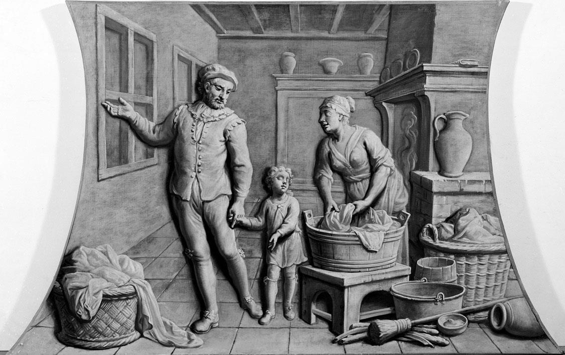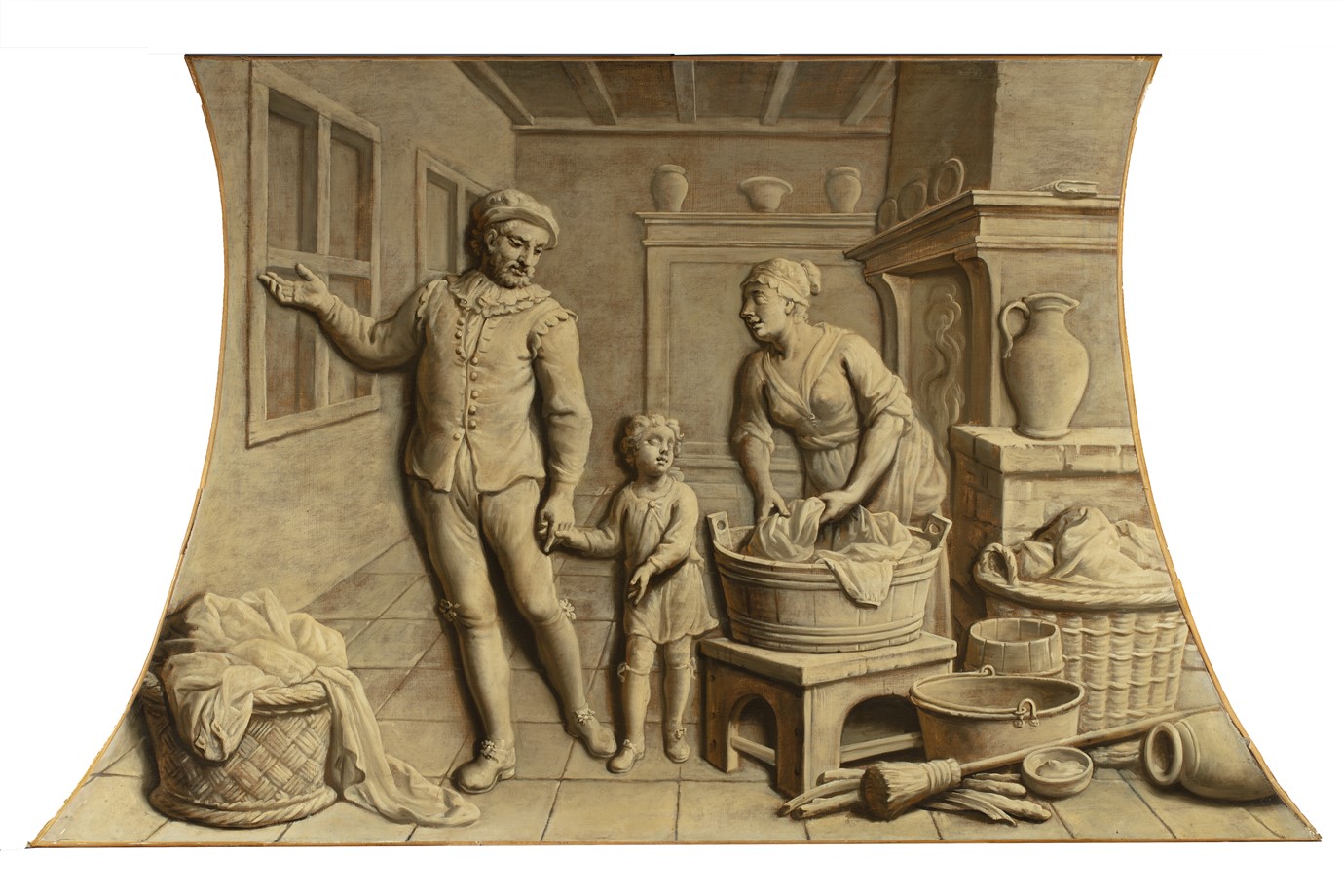 Eerste van een reeks van zeven schilderijen met betrekking op het leven van paus Adrianus VI (Adriaen Florisz Boeyens 1459-1523). De grisaille heeft waarschijnlijk als supraporta gefungeerd.