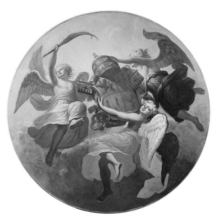 Tondo met drie zwevende engelen met het pauselijk wapen van Adrianus VI