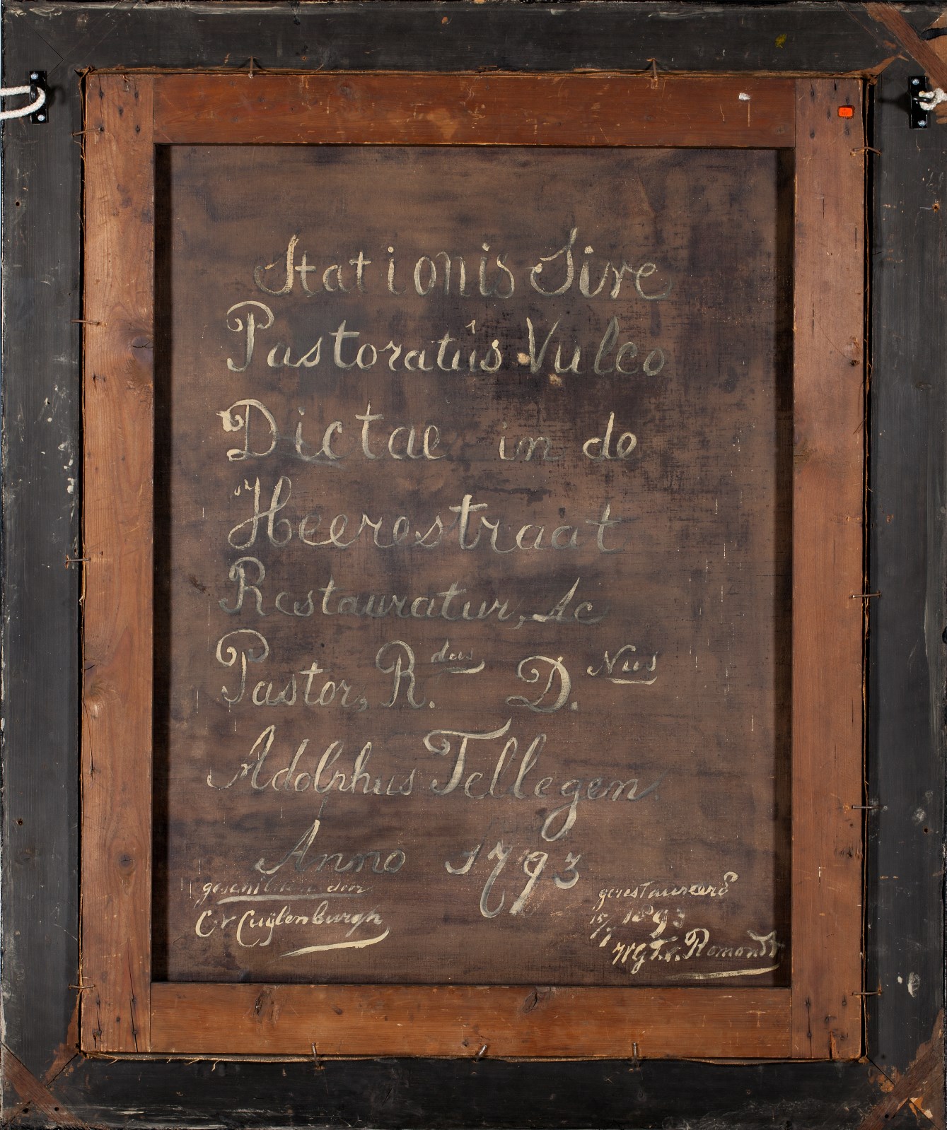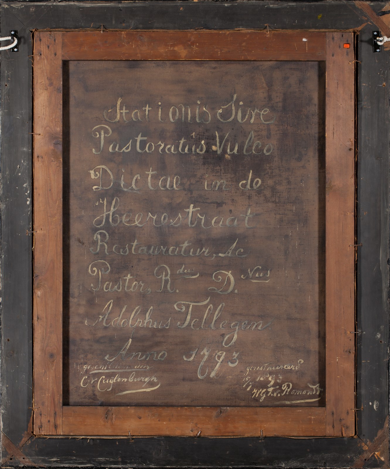 Uit cat. Utrecht 2002: Gesigneerd en gedateerd midden rechts: C v Cuylenburg fecit a°1793. Rechtsboven een niet geïdentificeerd familiewapen. Bij restauratie in 1893 werd op de achterzijde het volgende opschrift aangebracht dat waarschijnlijk grotendeels teruggaat op een oudere inscriptie: ‘Stationis Sive / Pastoratus Vulco [sic] / Dictae in de Heerestraat / Restauratur [sic], Ac Pastor, ...