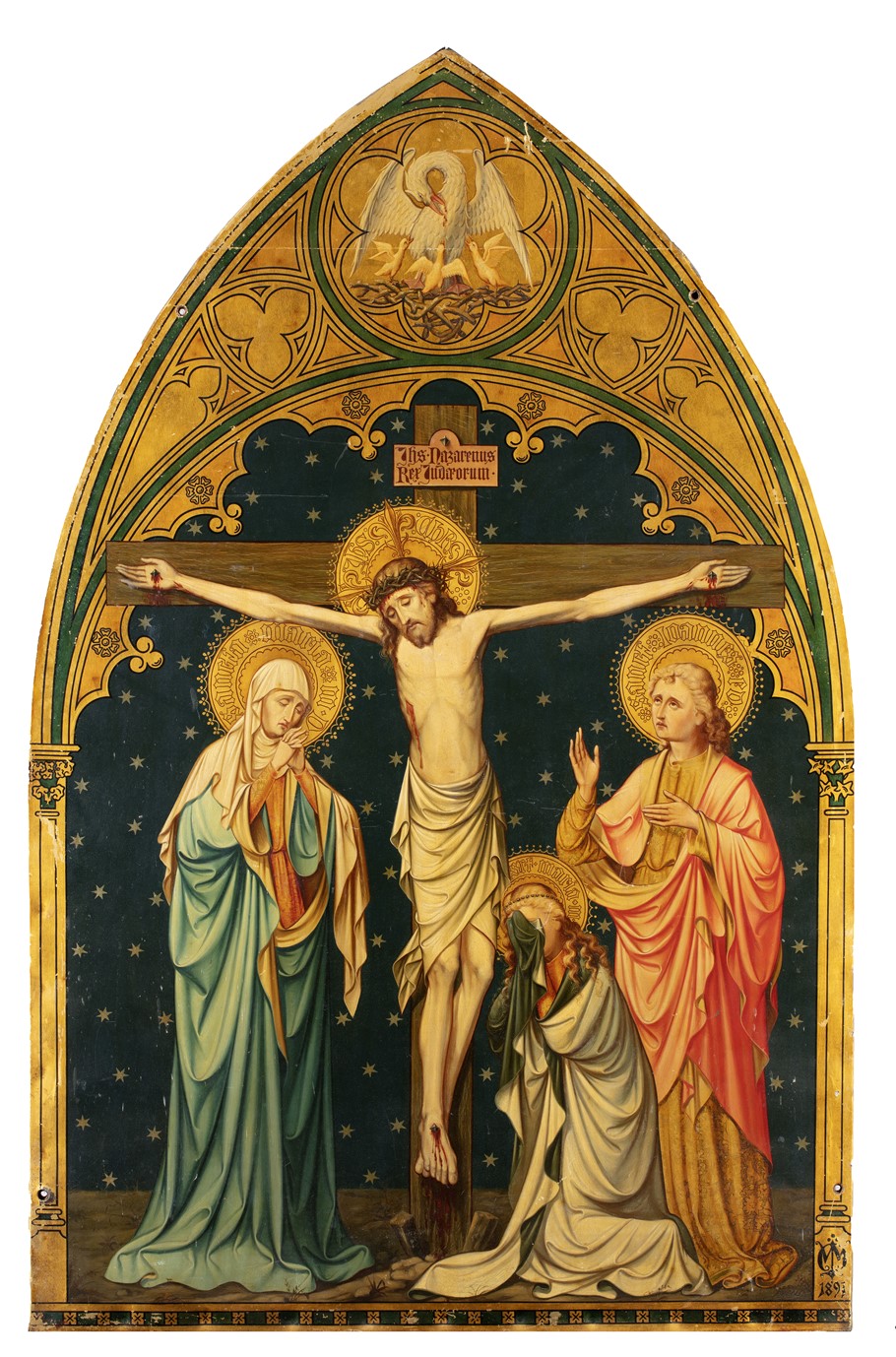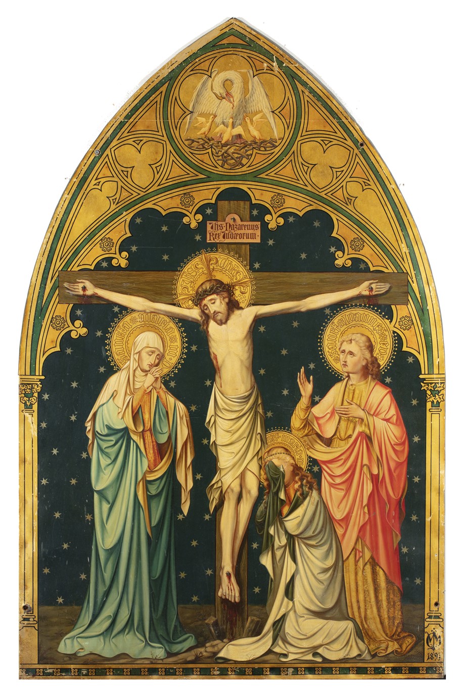 Gemonogrammeerd en gedateerd onder het rechter zuiltje: WM (ineen) / 1891. Opschrift op het kruis: Jhs. Nazarenus / Rex Judæorum. (Jezus de Nazareeër, Koning der Joden). In de nimbus van Maria: SANCTA MARIA M D; van Johannes: SANCT IOANNES ED; van Maria Magdalena: SCT MARIA M.
