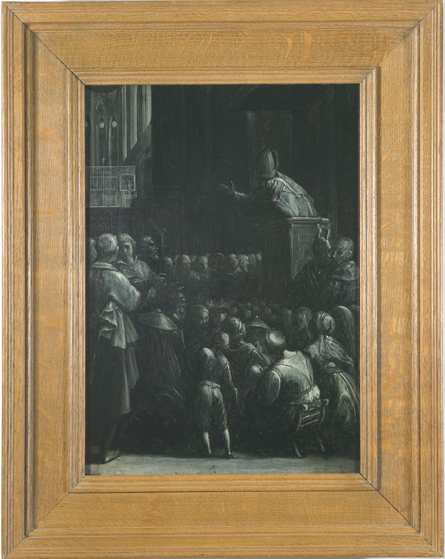 Op een preekstoel, die staat opgesteld aan de rechterzijde van het schip van een kerk, preekt bisschop Eligius tot een rondom hem geschaarde groep toehoorders. De meeste vrouwen onder hen zitten, de mannen staan. Voor het koorhek op de achtergrond staat een altaar met een beeld van Eligius met zijn attribuut, een hamer. De voorstelling ...