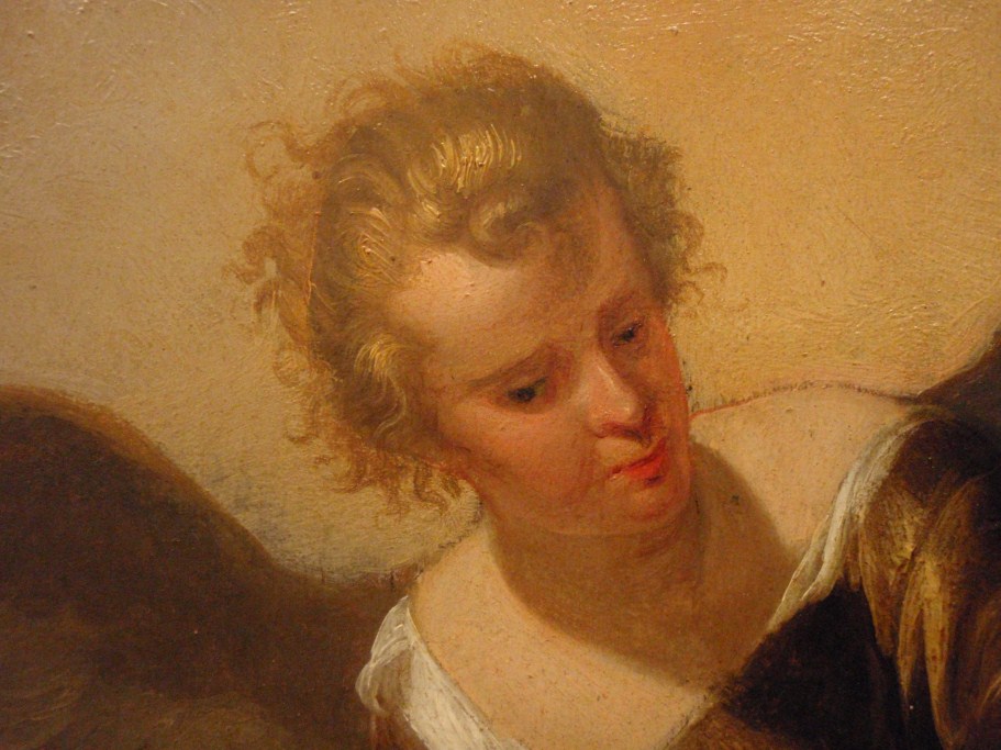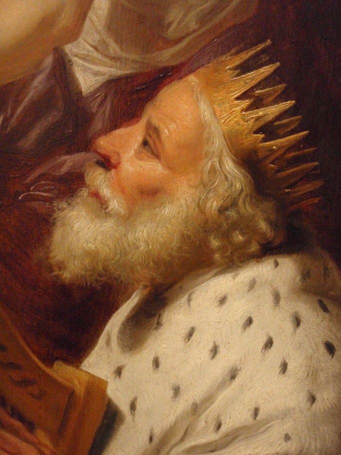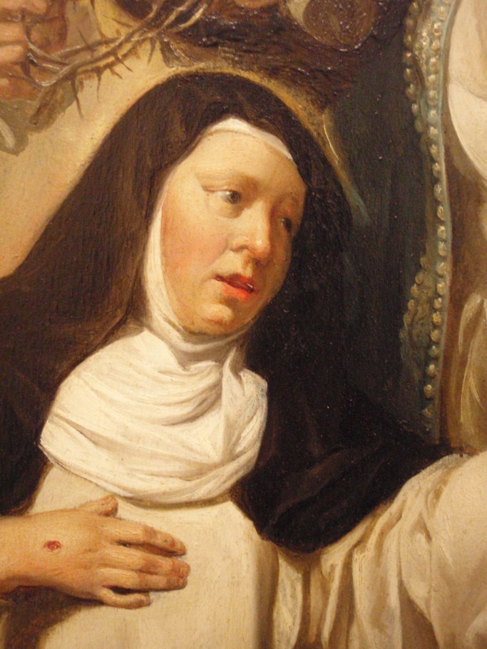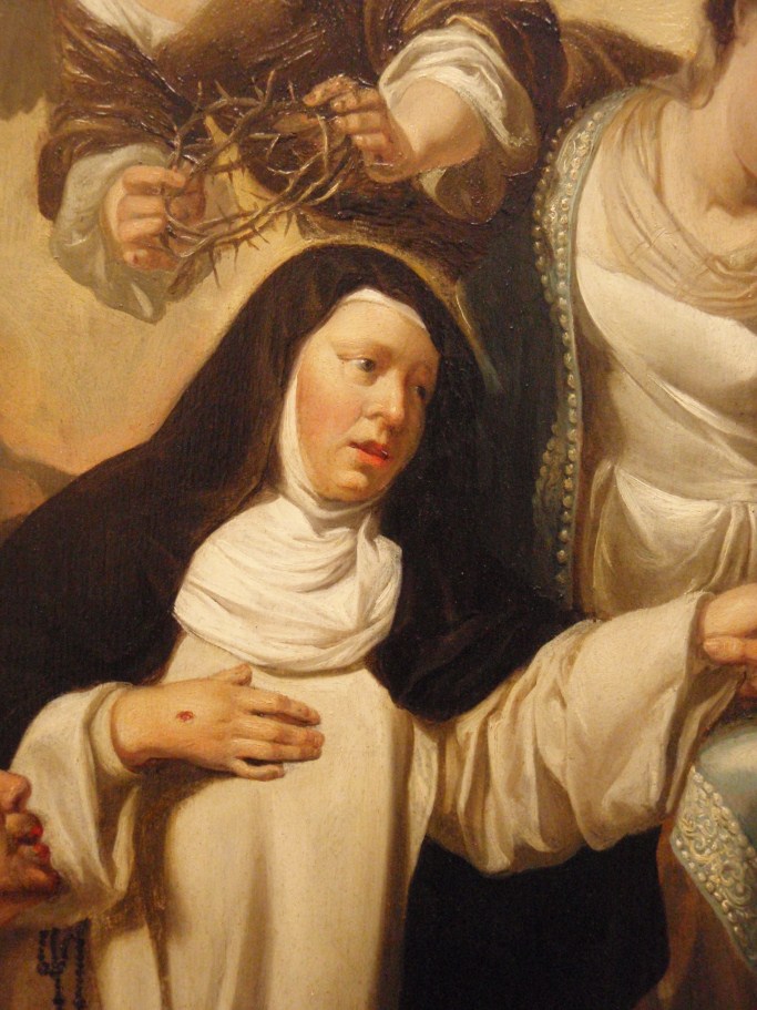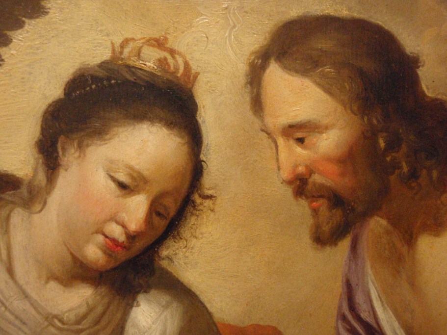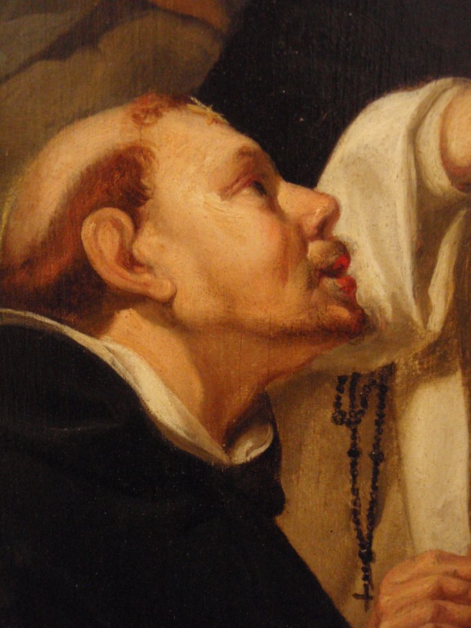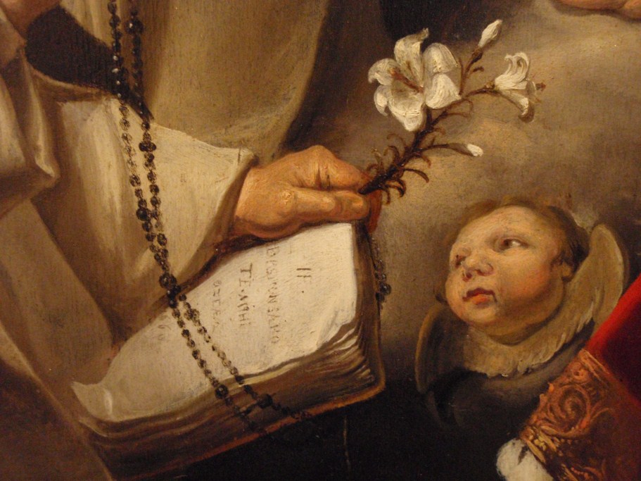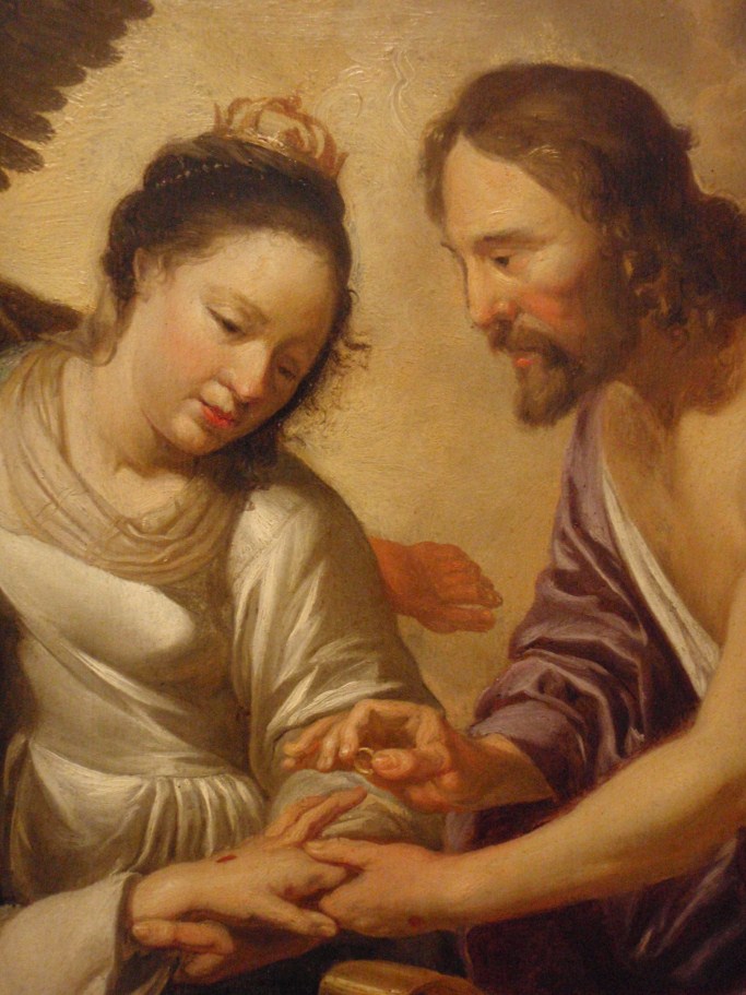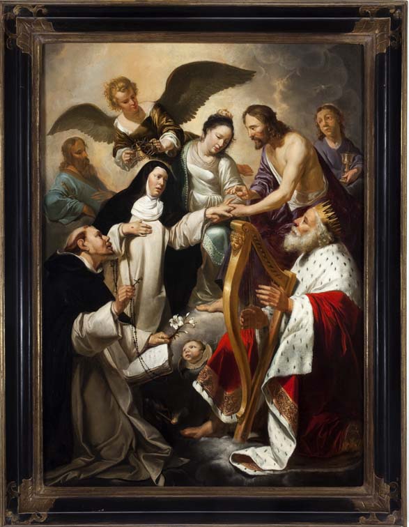 In het midden schuift Christus, geassisteerd door Maria, een ring aan de vinger van Catharina. Linksvoor knielt Dominicus en rechts David. Op de achtergrond de apostelen Paulus en Johannes. Gedateerd en gemonogrammeerd in het opengeslagen boek van de H. Dominicus met daarbij de tekst: HF (ineen: ‘Heerschop Fecit’) / DESPONSABO / TE • MIHI / ...
