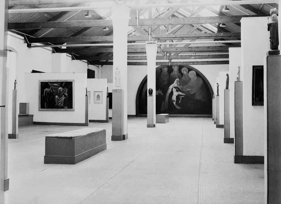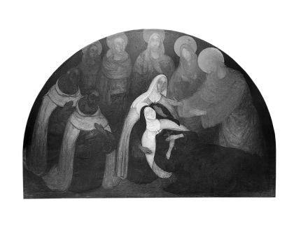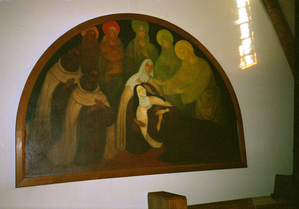 Gesigneerd en gedateerd rechtsonder: a.servaes 1920. De stervende Teresa wordt ondersteund door de karmelites Anna van Sint-Bartholomeus, links de karmelieten Johannes van het Kruis en Antonius van Jezus; op de achtergrond van rechts naar links Christus, Maria, haar moeder Anna en de heiligen Dominicus en Franciscus.