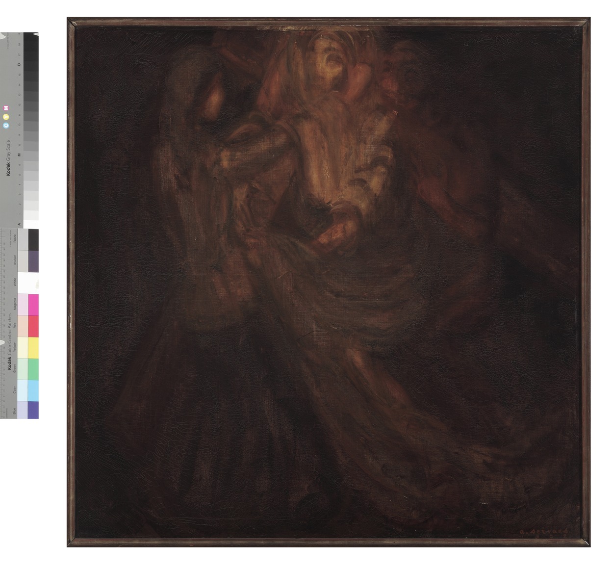 Christus, met vlak achter zich Simon van Cyrene houdt tijdens de kruisweg halt om Veronica zijn aangezicht met een doek te laten afdrogen. Gesigneerd en gedateerd r.o. "a.servaes. 1922."