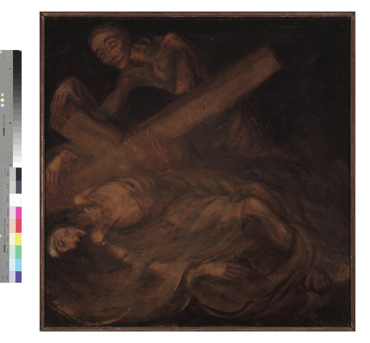 Christus valt voor de derde keer, dit keer languit achterover, en ligt nu geheel ter aarde. Achter hem een gebogen Simon van Cyrene, die het kruis onder de dwarsbalk en aan de bovenzijde tegen houdt. Gesigneerd en gedateerd "a.servaes. 1922."