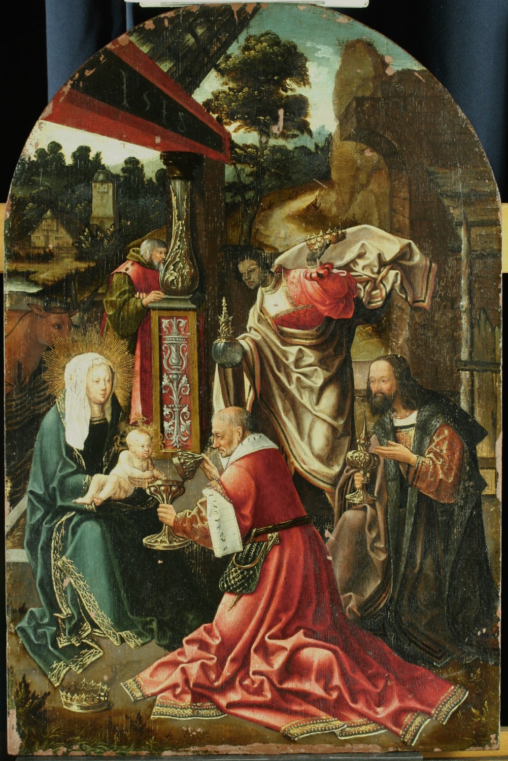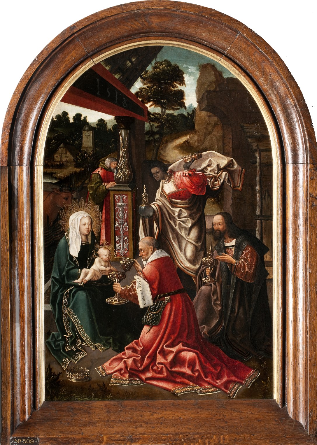Onder een rieten dak, steunend op een balk die gedragen wordt door een kolom met Renaissance-vormen, zit de H. Maagd in blauw gewaad en witte hoofddoek met het naakte Christuskind op de schoot, dat beide handjes uitstrekt naar de geopende gouden beker, die de oudste der Koningen het voorhoudt. Koning Melchior knielt rechts en draagt ...