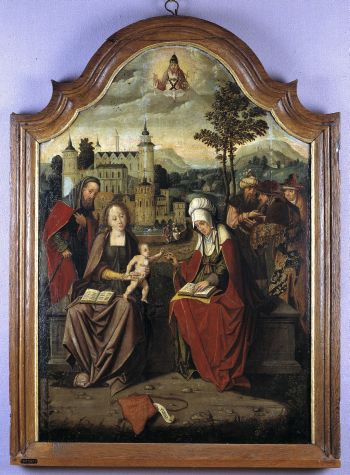Op de voorgrond Maria met kind, Jozef en Anna met haar drie echtgenoten. Uit de tas steekt een banderol met de tekst: [GRAT]IA PLENA (Vol van genade). In de wolken boven het Christuskind God de Vader en de duif, symbool van de H. Geest. Bij de slotgracht een profaan paartje. Op de achtergrond rechts Aankondiging ...