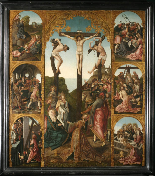 Kruisiging met meerdere figuren en zes taferelen uit het lijden van Christus