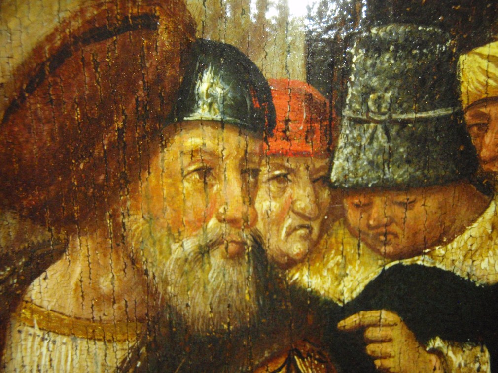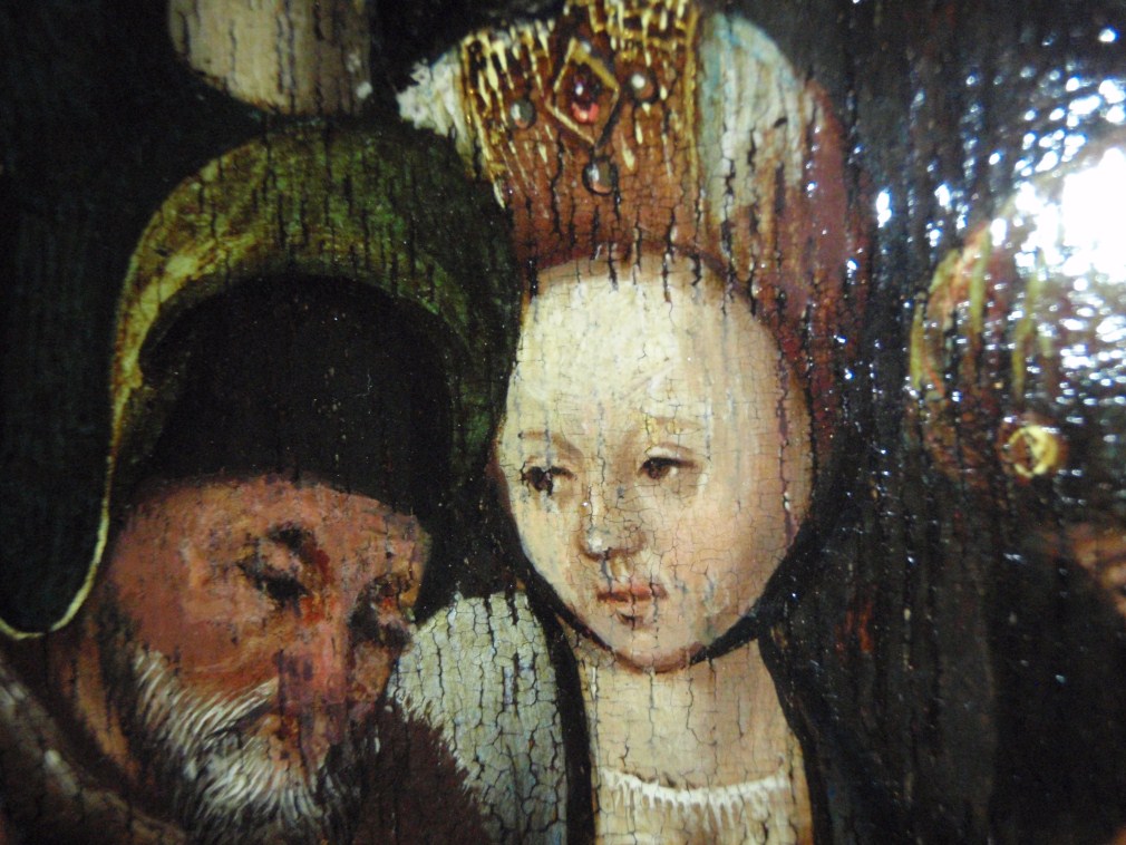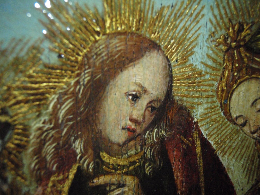 Het gouden geschilderde lijstwerk maakt dat het paneel oogt als een triptiek, waarvan de 'zijluiken' zijn opgebouwd uit drie voorstellingen boven elkaar. De centrale voorstelling toont Christus aan het kruis tussen de twee gekruisigde moordenaars in een bergachtige omgeving met rechts op de achtergrond Jeruzalem en in de verte de zee. Maria Magdalena zit geknield ...