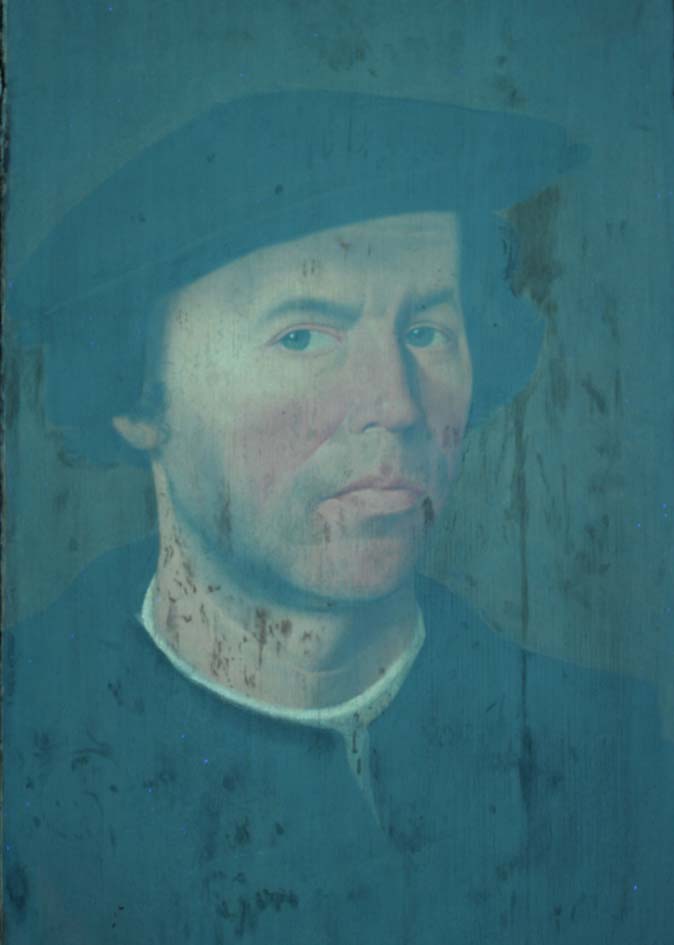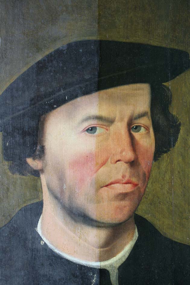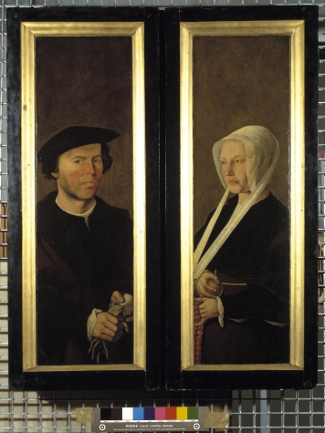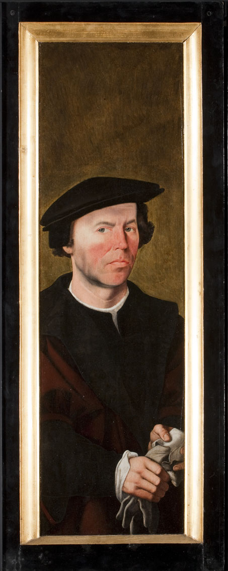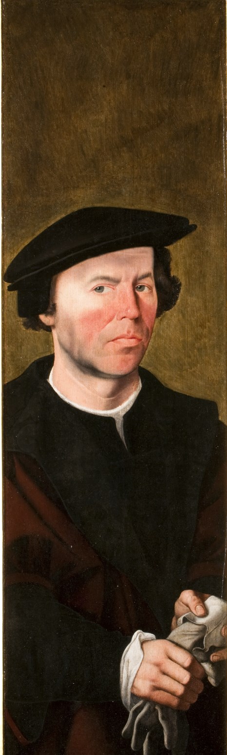 Buitenluik met het portret van een stichter, als halffiguur en driekwart naar rechts gewend, tegen een bruingroene achtergrond. Hij is gekleed in een zwarte wambuis en een donkerrode tabbaard met zwarte kraag en heeft op het hoofd een zwarte baret met oorkleppen. In zijn handen houdt hij een handschoen. De binnenzijde van het luik toont ...