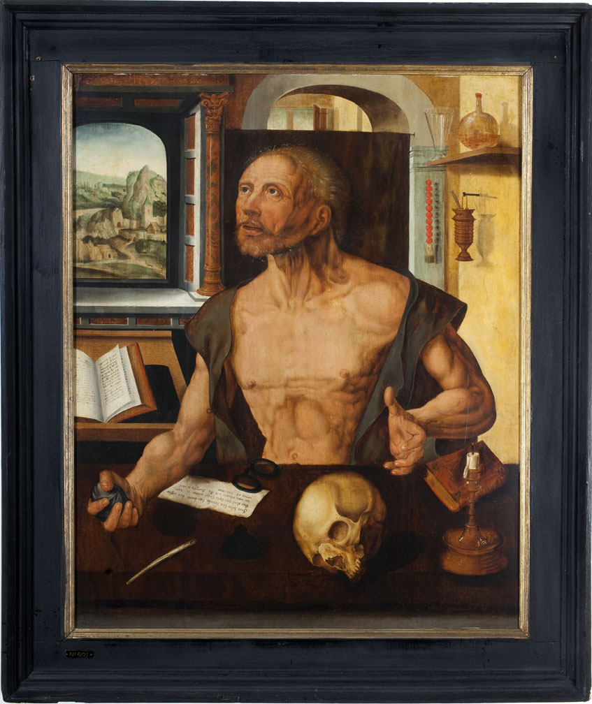 De heilige Hieronymus zit achter de tafel in zijn studeervertrek waarvan een raam uitzicht biedt op een bergachtig rivierlandschap. Hij is voorgesteld als boeteling met een nagenoeg ontbloot bovenlijf en een steen in zijn rechter hand. Op de tafel staan een inktpot en een kandelaar met pas gedoofde kaars, en liggen een pen, een schedel, ...