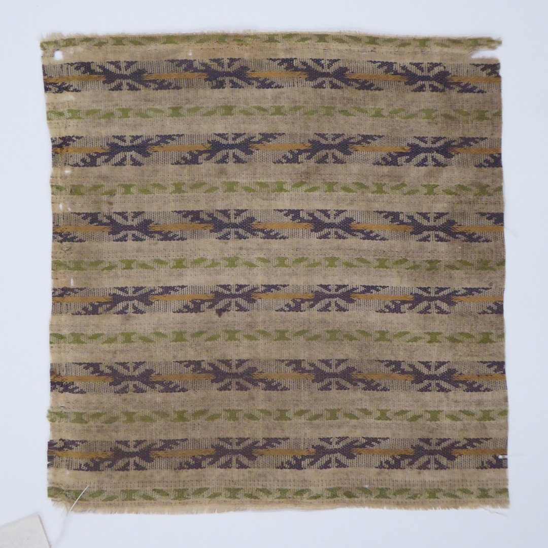 Gestreept lancé zijdeweefsel met tegen elkaar indraaiende S-vormen, blauw, paars, geel, groen