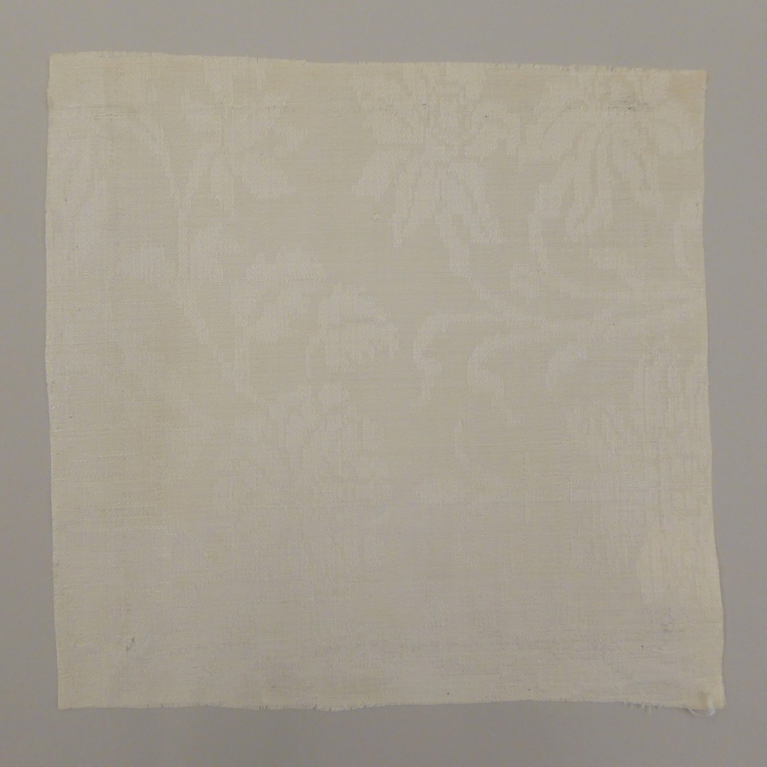 Linnendamast fragment van servet in zevenschachts satijnbinding, met florale motieven
